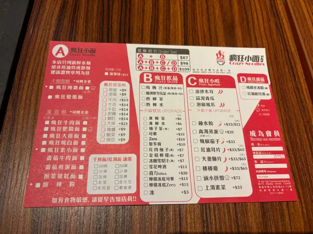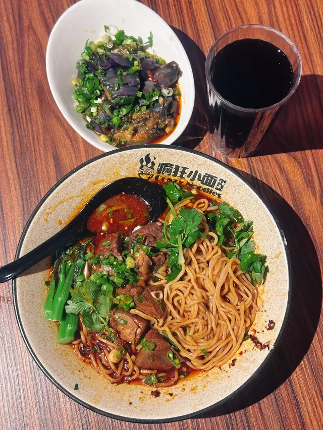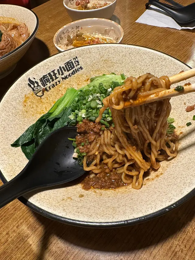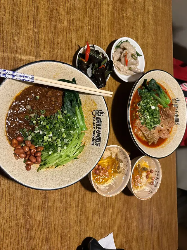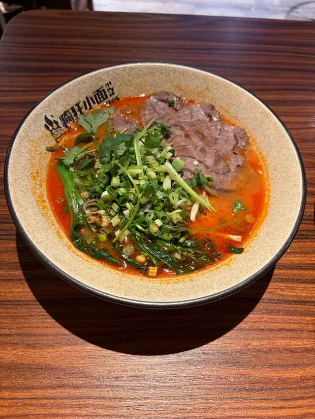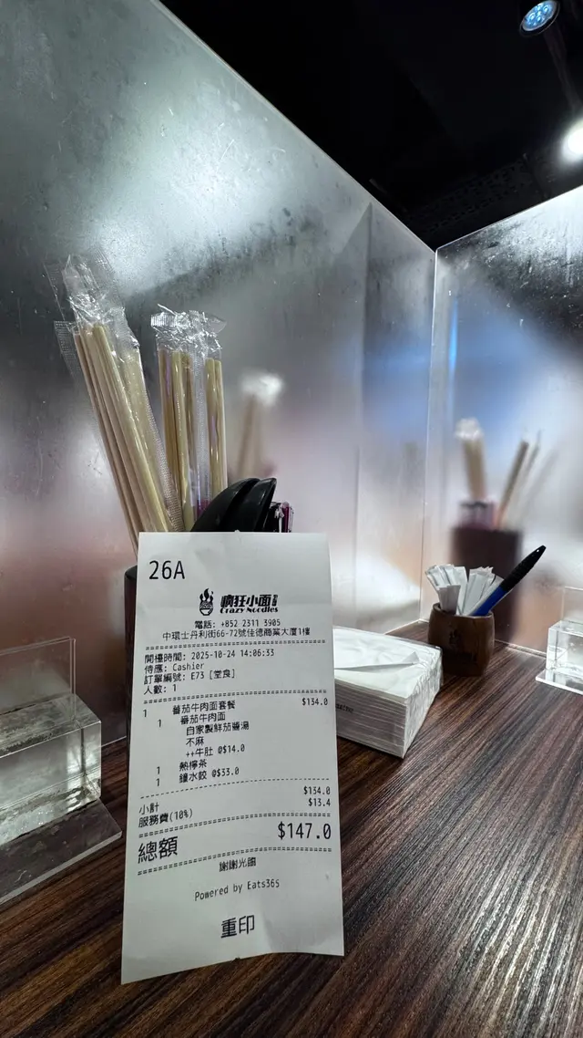 餐廳:瘋狂小面地點:中環士丹利街樓上餐館菜式:川菜餐牌:主打小麵(即係傳統重慶小麵),餐牌基本上就係三款組合既麵餐,麵+飲品 $87麵+飲品+小吃/甜品$98麵+飲品+小吃+甜品 $109另設加一。飲品同小吃都可以加錢升級。另外可以再加料。麵可以揀乾撈麵或者湯麵,同埋麻度同辣度等。自己剔紙落單。涼拌木耳 (跟餐)小食份量都唔細,爽口木耳加有蒜蓉,伴有蒜片同辣椒,都幾辣下。番茄煎蛋牛肉麵 首先飲啖番茄湯,湯底超正,帶有天然番茄甜味,食到番茄肉。番茄配蔥花同芫荽好夾!另有5塊超薄切牛肉,非常重滷水味,配番茄湯剛好!仲有三條菜心苗。呢度用新鮮水麵,餐牌寫明非油炸或掛麵,又真係食得出,好健康。d麵都唔會話太軟身或一pat pat,分量足。我另外加左款料。煎蛋 加$9 另加一煎蛋全熟,皮脆唔乾,唔錯。烏梅汁 (跟餐) 唔洗加錢飲品有4款,烏梅汁酸酸哋,好開胃。呢度d麵都唔錯,上菜超快速,果然係中環效率,地點又方便。最欣賞呢度有私隱度既單人座位,適合我呢d速食個飯就返工人士。…查看更多