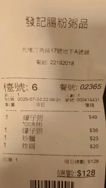 晚上大约九点到来,入座率超过一半,通常都是一或二人的食客,主流都是街坊吧,男士通常都斜孭袋及穿短裤,小店深秀街坊支持。期间的外卖并没有许多,印象终止听见一次响机,所以现场也不是太吵,我就静静找了一处角落就坐,还开了直播,后来观察现场情况,环境声是可以的,就是一般能够聊天的那种。我叫了一客炸两及蚝仔粥,前者就一般般吧,并没有很脆的效果,而且温度并不太热。至于是由的份量,国际惯例都是有多冇少的,总之就一定够味吧。蚝仔粥方面用了十足!配料环包括大量葱花及姜丝,调味的感觉下了不少胡椒粉,这个我就觉得不够讨好了,因为自己口味比较爱清淡。…查看更多