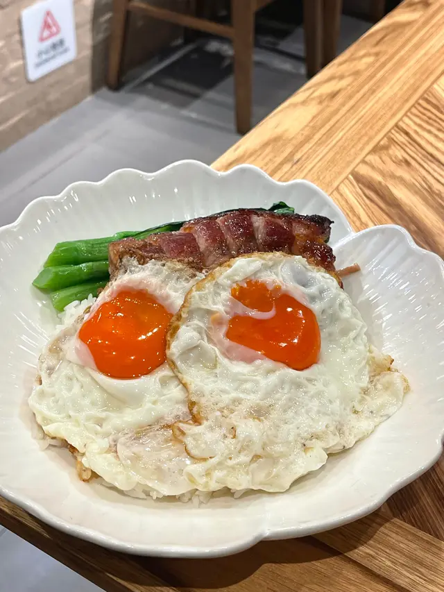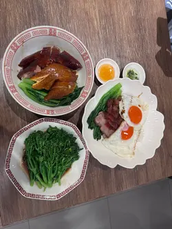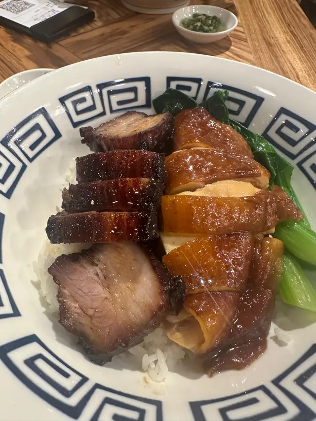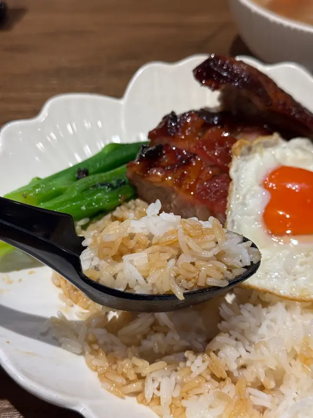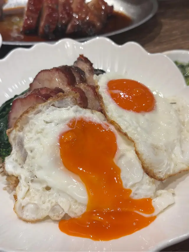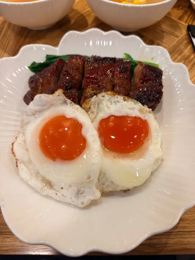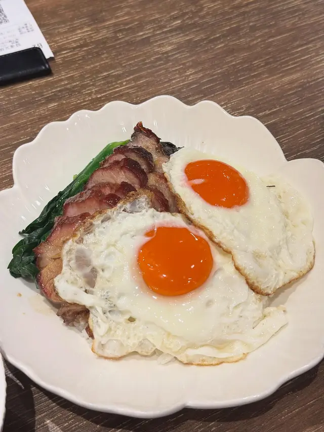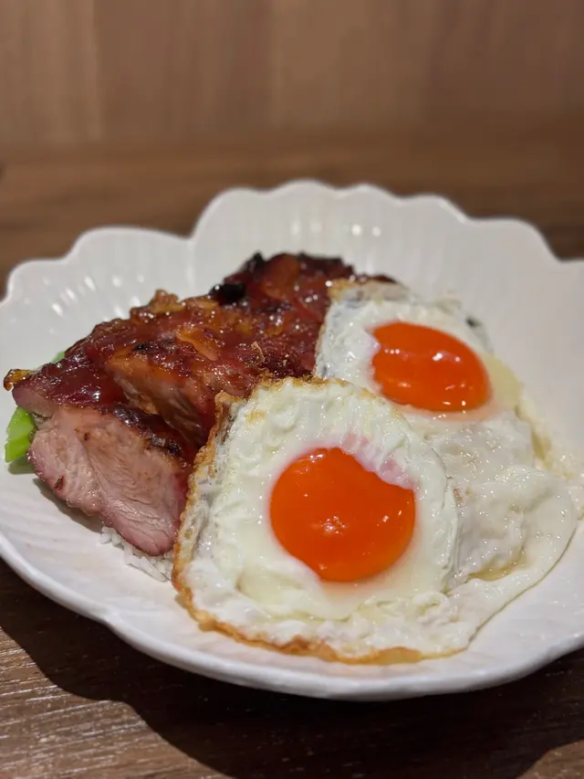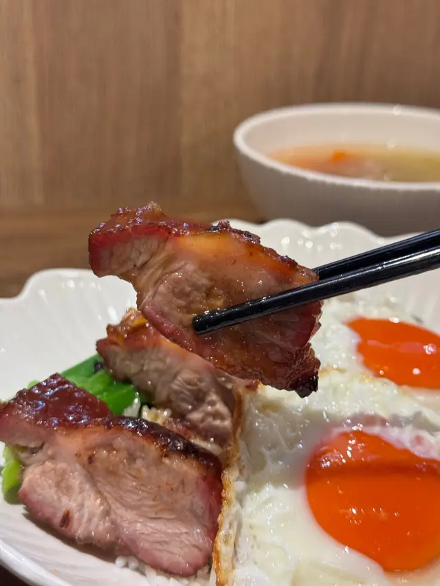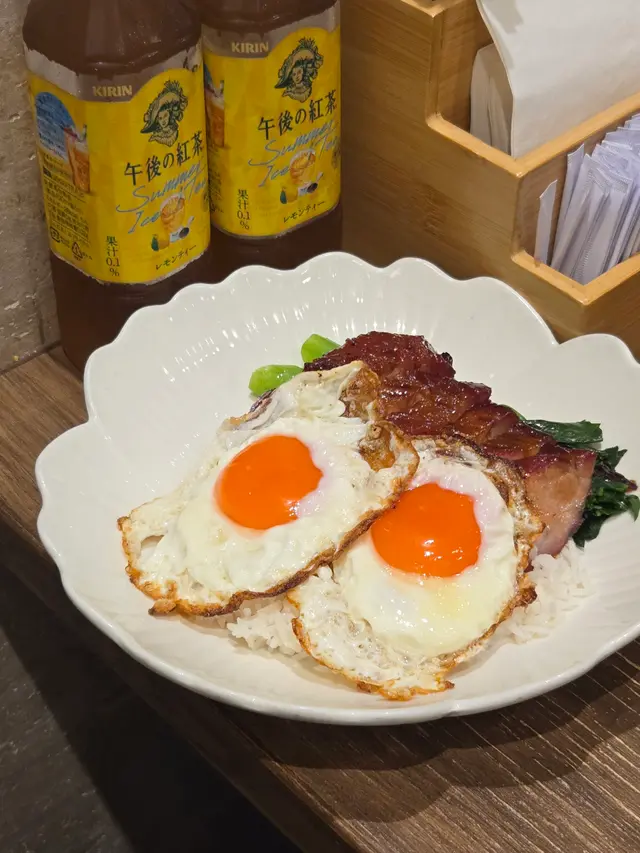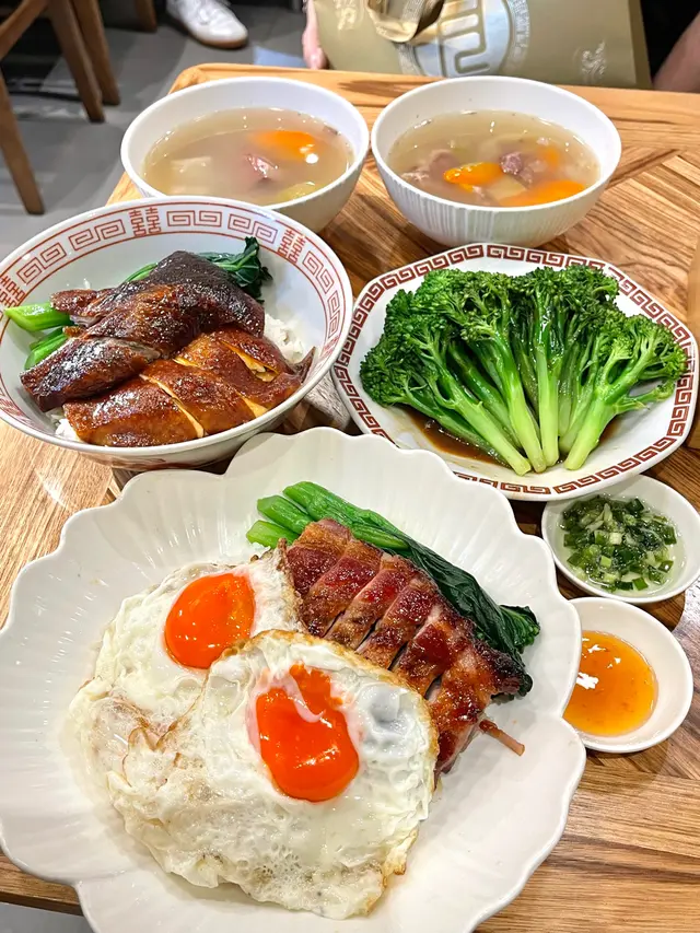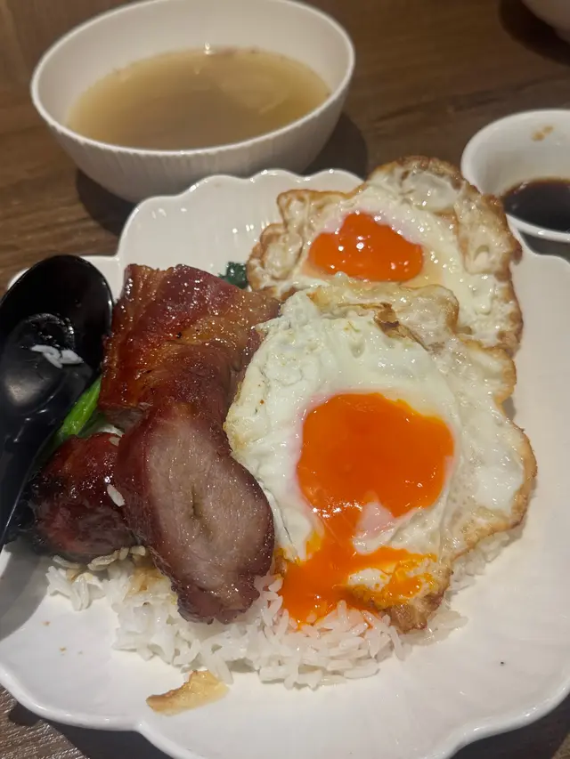 位於灣仔的「發達叉燒」是一間人氣高企的地道燒味店🔥,主打招牌蜜汁叉燒😋,還供應燒鵝、油雞、豬油撈飯等。餐廳裝潢簡潔光猛,設有傳統開放式斬燒味廚房🔪,而店內座位雖然不多,但翻桌率很高,店外經常大排長龍🚶♂️🚶♀️,排隊時見到不少食客專程前來買外賣,亦有熟客報到,氣氛熱鬧💬🥰叉燒雙蘭王蛋飯叉燒雙蘭王蛋飯份量十足🍚,叉燒肥瘦相間🐷,肉質嫩滑,蜜汁味道甘香🍯,脆邊太陽蛋選用蘭王蛋🥚,蛋白煎至微焦脆邊,蛋黃保持完美流心😍,蛋香撲鼻,底下白飯吸盡叉燒醬汁,每一口都香濃惹味🤤‼️茅台醬油雞燒鵝飯茅台醬油雞燒鵝飯同樣份量十足🍱,一上桌就聞到淡淡茅台酒香🍶,茅台醬油雞嫩滑入味🐔,酒香滲透雞肉,層次豐富又不搶味✨;燒鵝🪿皮脆肉香🔥,油脂分佈均勻,入口香濃而不膩🤤。燒味配白飯絕對是王道🍚💯老火例湯今日的例湯是 青紅蘿蔔湯瘦肉湯🥕🐷🥣,湯底清澈不油膩,清甜滋潤😊。…查看更多