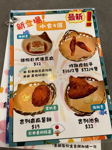 炙烧慢煮鸭胸配鸭浓汤乌冬 ($78) ★★★★★这间餐厅主打乌冬,但没有独沽一味,餐牌菜式都非常多元,乌冬的汤料也会因应配料有所改变。譬如这份鸭胸乌冬的汤料是鸭浓汤,确实很有鸭油香,还配有相片左上角的鸭油,很有特色。我跟随餐牌建议在食用中段才加入鸭油,加入后果然如餐牌所言,汤底感觉没有变得更油腻,反而有点清新的鸭味。鸭胸煎香后有炙烧一下外皮,食落有明显而恰到好处的焦香。整体乌冬味道很有惊喜,卖相也相当不错。小食迷你日式冻豆腐及饮品冻牛蒡茶则正常发挥。整体而言,这次食这碗乌冬令人有耳目一新的感觉,座位宽敞,店员服务态度也不错,值得推荐~