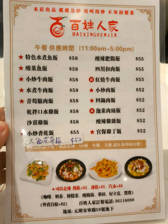 百姓人家 (元朗) 网址: https://s.openrice.com/QrLS0m0WD00 地址: 香港元朗元朗安寧路59號裕豐洋樓地下A號舖 电话: +852 36116088