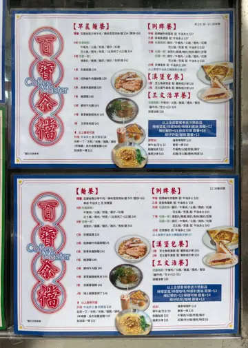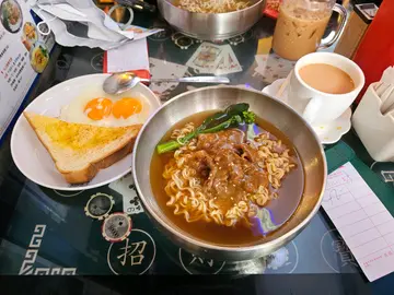 朋友推介左一间港式早餐店,心血来潮一大早去,早上已经满满的用餐人潮不夸张,原来百宝小食可是在地人特爱的美食店榨菜肉丝公仔面的榨菜很重咸,味道够,但是搭著公仔面一起,反而恰到好处。面包内夹著一层奶油,半熟蛋咬下会流金黄蛋液,小心不要滴到衣裤啦土司夹番茄,吐司双边烤过之后,中间夹著番茄跟起司片,番茄多了香甜跟水分,所以不用担心土司吃起来过于干口,味道部份多了起司咸香,就还不错。冻奶茶很好喝,茶味重,奶味也够浓,相当顺口。…查看更多