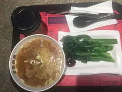 是日来西九高铁站买车飞,准备下星期的假期。买车票的流程混乱,而且排队等侯时间过久,工作人员服务礼貌差,运行有待改进。买完车票,一肚气,坐底食个面平伏心情。高铁站的canteen 设计很时尚有特色,不过座位以硬板凳为主,坐得不甚舒适。当天canteen 有七家餐厅的食物售卖,价格不算便宜。百福面家的面食只可跟套餐,没有散点,套餐有面、菜和饮品,最平$52 起。点了个牛腩面,柱侯牛腩都颇入味,牛腩炆得颇稔,整体不错。