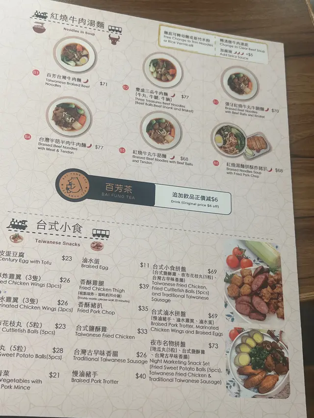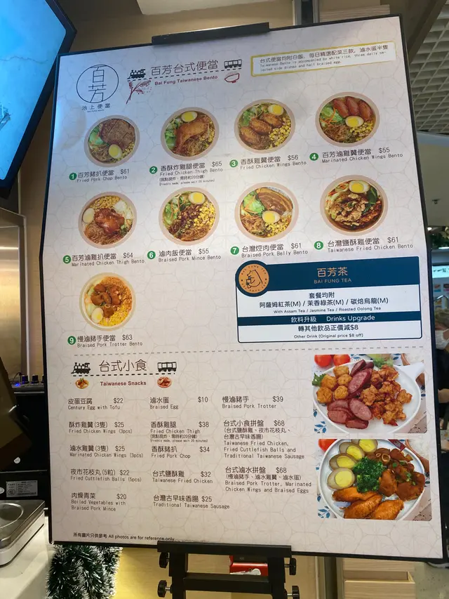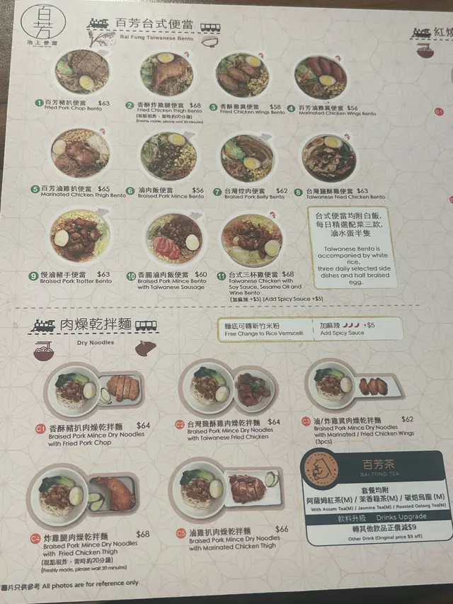 今日太想食台灣嘢,喺香港仔都冇乜台灣餐廳,search咗一陣就去咗百芳池上便當食,個台灣便當解下癮Menu上面主要分三大類,便當、拌麵同埋湯麵類,今次就試咗佢嘅便當同埋乾拌麵香腸滷肉飯便當$60香腸份量大概係一條台灣腸切開,台灣腸不嬲都好好食嘅個便當嘅材料都算幾豐富,有齊粉絲、粟米、半隻滷蛋再加滷肉,撈埋一齊食好有滿足感滷水雞扒乾拌麵$66乾拌麵個醬汁應該係滷水汁,甜甜地嘅滋味但係個面底實在係太細,食咗兩三啖已經冇咗一大半,食完都唔覺飽滷水雞扒夠入味,有一隻手掌心咁大紅豆牛乳$6另外加咗$6叫咗個紅豆牛乳,唔知點解佢嘅嘢飲冇封口,見到隔籬枱個女仔一嘢做倒瀉咗,確實係值得改善紅豆牛乳味道麻麻哋,個紅豆好硬…查看更多