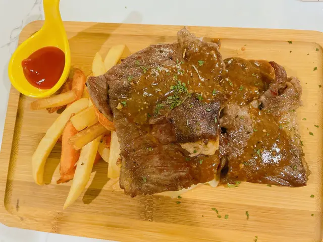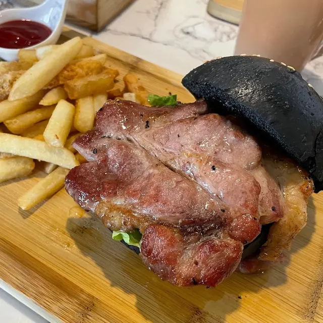 餐廳係地鐵出入口附近,非常方便。叫得「皇后冰廳」,餐廳裝修都似模似樣,兩盞大吊燈好有宮庭感覺我地星期日中午時份去到,唔算多人,唔需要等位餐廳空間感都足夠,坐得幾舒服既我地叫咗一個咖哩海鮮意粉($58)個餐用木板上,感覺都幾清新,意粉份量略為少咗啲,咖哩味道還可以,海鮮份量都足夠既,入面有唔少都係魷魚,亦有大大隻青口海鮮味道都正常啦,唔算太特別另外就叫咗個All day breakfast配西班牙黑豚肉($72)個餐係跟餐包既,作為一個lunch份量十分夠All day breakfast都齊料既,雞肉腸、黑豚肉正常發揮,比較特別既係佢配咗塊忌廉薯餅,入口即溶,都幾好食:)最後配咗杯凍奶茶(跟餐+$3)茶味太重,奶味少,入口太澀對我呢個奶茶控嚟講真係唔太收貨整體感覺都不過不失既,如果正常價位想搵間西餐廳食下,都值得一試…查看更多