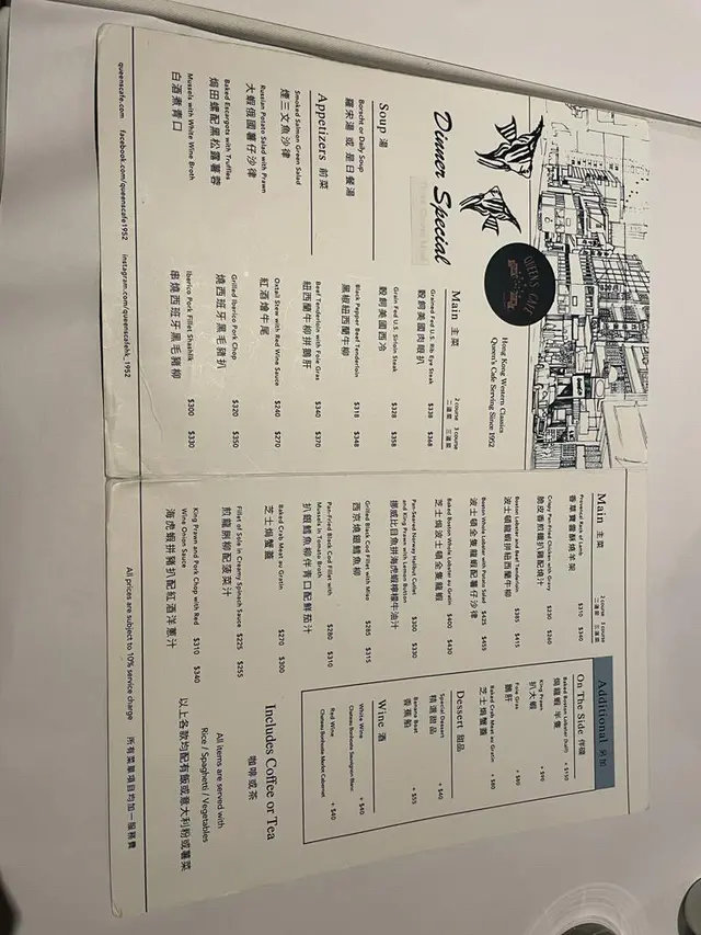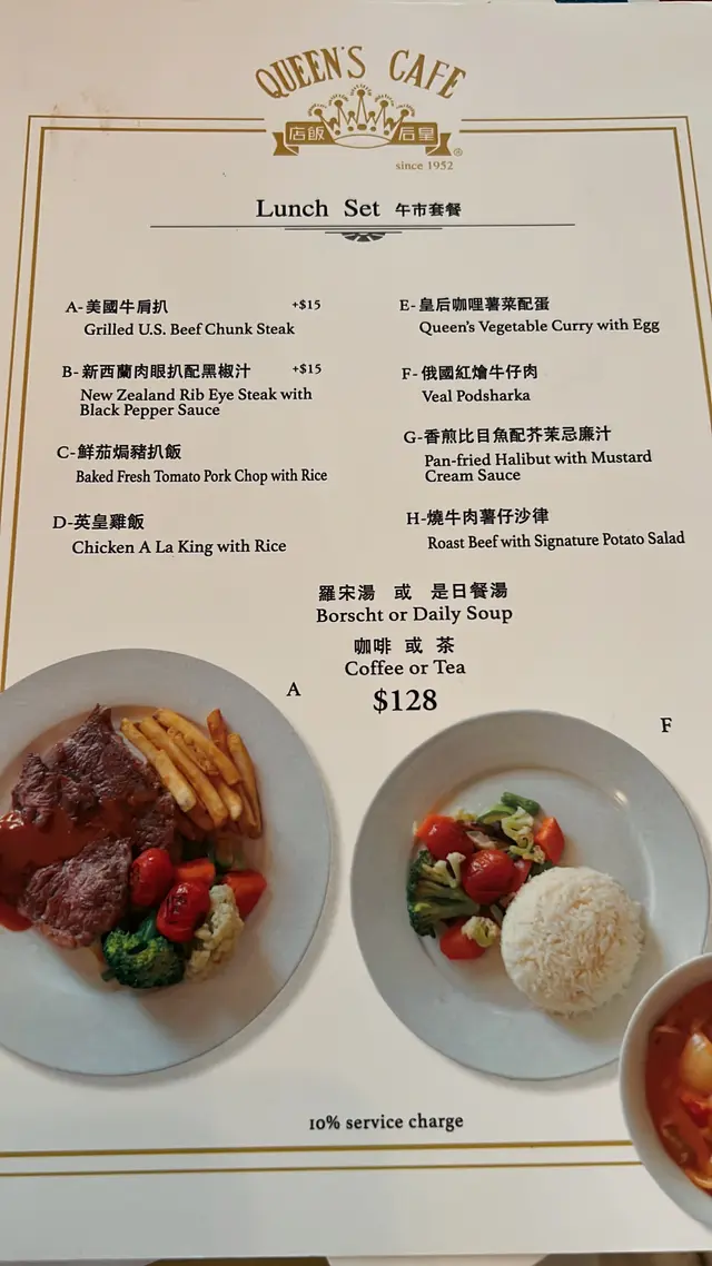 第一間去既係九龍塘又一城既皇后飯店皇后飯店都算係間連鎖餐廳1952年創立超過70年歷史好似仲黃黃地而呢間九龍塘店就98年開業但就唔係話全線結業執左之後會係黃竹坑開番我地係結業前一個月去既星期日兩點幾去到都排左半個零鐘先入到去始終都係商場餐廳門面係比較靚仔既入面仲有吊燈裝潢叫做舊而不殘即係座位黎講算係咁就算係後武肺年代兩個人都可以坐四人檯眼見格離檯一個人都可以坐四人檯而出面仲有好多人等緊不過應該就執所以用左紙檯布一野拎走就掉得因為已經過左三點所以係有下午茶餐不過我地一心想試下個豉油西餐所以都係揀番lunch set網上睇過星期六日係貴d既平日128假日150其實都真係算比較貴而且餐廳背景話係俄國菜餐廳唔知係結業前定因為午餐時間就睇唔到有咩俄式味道真係好豉油西餐既餐牌而佢menu係有餐廳介紹既set menu有跟餐湯就係最普通既紅白二湯牛油麵包係好傳統既茶餐廳味道都唔知幾多年無食過未飲完個湯就有野食先上既竟然係焗豬扒飯面頭都有幾件蕃茄size同一般快餐店差唔多但豬扒既份量少帶骨有切好個問題都係大家都唔鍾意既三色豆同埋上檯果時個兜都只係暖身焗既時間完全唔夠感覺樣樣都差少少的確係有種快餐店仲好過佢既感覺而連加一既價錢更加係快餐店既三倍牛肩扒就要再加25蚊仲貴過一般既渣渣聲鐵板餐叫做有兩大塊但成塊扒又係鬆到hihi食落口味同我公司個狗飯堂差唔多仲好意思問幾多成熟餐茶凍飲唔洗加錢咁其實係預左普通質素既但無諗到呢間餐廳可以做到同一般茶餐廳無分別姐兩個lunch set連加一都三百中係坐得舒服lor侍應都似係炒散做到散場果隻檯布又係換過張紙就得真係好有臨結業賺多一水既感覺…查看更多