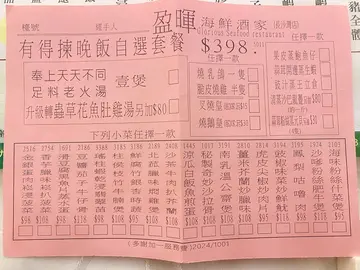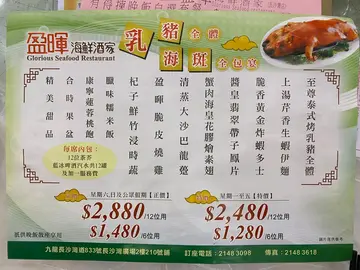 # 团年饭菜单在这个特别的日子里,团年饭的菜单丰盛而精致,象征着团聚与新年的美好祝愿。以下是盈晖为我们的精心准备的菜品:## 菜单### 至尊泰式烤乳猪全体外脆内嫩的烤乳猪,配以独特的泰式调味,令人垂涎欲滴,象征着富贵与吉祥。### 上汤芹香生虾伊面新鲜的生虾与香脆的芹菜搭配,浸泡在浓郁的高汤中,丝滑的伊面更是提升了整道菜的风味。### 脆香黄金炸虾多士外层金黄酥脆,内里鲜嫩多汁的炸虾,搭配香脆的多士,口感丰富,令人回味无穷。### 唱王翡翠带子凤片新鲜的带子与翡翠般的蔬菜相结合,色彩斑斓,口感清新,寓意着年年有余。### 蟹肉海皇花胶会素翅结合海味与素食的经典之作,蟹肉、花胶和时令蔬菜的搭配,既美味又营养丰富。### 清蒸大沙巴龙趸选用新鲜的大沙巴龙趸,清蒸至刚刚熟透,保留了鱼肉的鲜美与营养,是一道不可或缺的佳肴。### 盈晖脆皮烧鸡香气四溢的脆皮烧鸡,皮脆肉嫩,搭配特制的酱料,让人一试成主顾。### 杞子鲜竹浸时蔬新鲜时蔬与杞子的结合,清淡可口,既健康又美味,为丰盛的团年饭增添了一丝清新。### 腊味糯米饭香气扑鼻的腊味糯米饭,粒粒分明,口感软糯,浓厚的年味让人倍感温暖。### 康宁莲蓉图包精致的莲蓉包,外形美观,馅料香甜,象征着团圆与和谐。### 合时果盘新鲜时令水果拼盘,色彩缤纷,既美观又健康,为团年饭增添了清爽的口感。### 精美甜品最后的甜品是精心制作的各式糕点,既满足味蕾,又为团年饭画上完美的句号。---团年饭不仅是美食的盛宴,更是家人团聚、共庆佳节的时刻。愿大家在这顿丰盛的团年饭中,享受美味,分享快乐,迎接新的一年!…查看更多