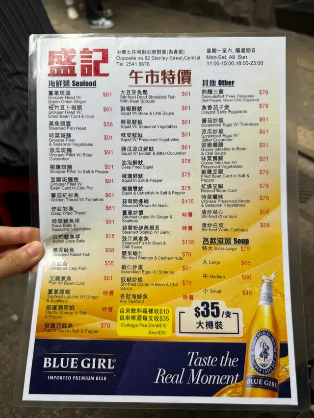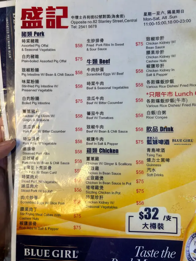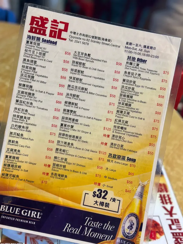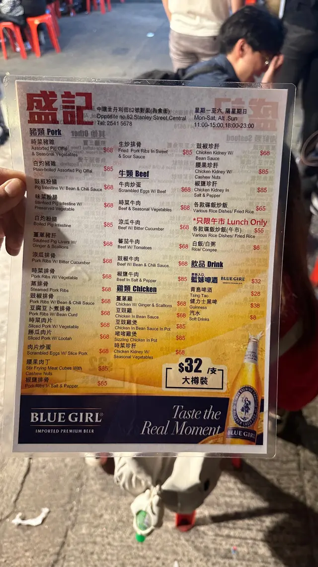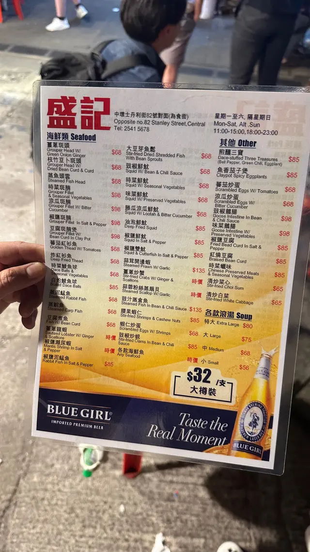 今日來到位於中環士丹利街嘅盛記大排檔食晚餐漆黑街道之中煙霧離漫,小小嘅大排檔卻充分體現出香港嘅特色,由於顧客不少,想光顧都要排隊稍等。用餐位置正正位於大街中心,同區同類型飲食店其實唔多,光顧嘅人除咗上班族就係遊客。店家嘅特別推介,基本上都係海鮮。其他菜式嘅menu給大家參閱。首先介紹嘅係佢哋嘅推介菜式,生炒排骨,$75即炒即上枱,望上眼幾分精緻,食落甜酸到位,肉質爽口。第二道椒鹽鮮魷,$75相比起其他點家嘅脆口鮮魷,呢度係用蒸嘅方法,健康之餘係鮮味嘅另一種表現,鮮魷爽而不韌。魚香茄子煲,$75熱辣辣上枱,魚香味芳香,茄子比較霖喎濕身。自費加白飯一碗,襯餸必備查看更多