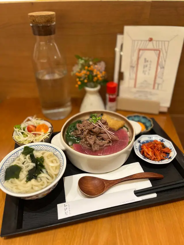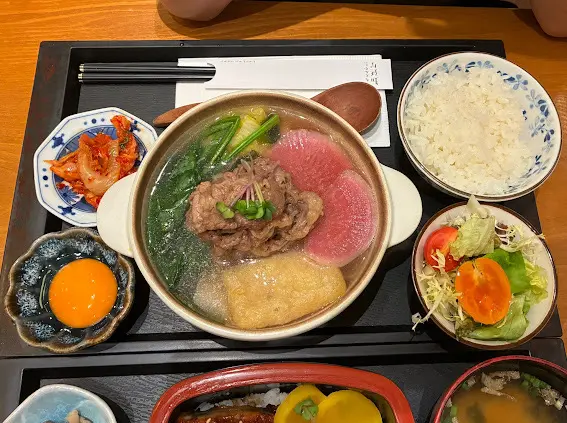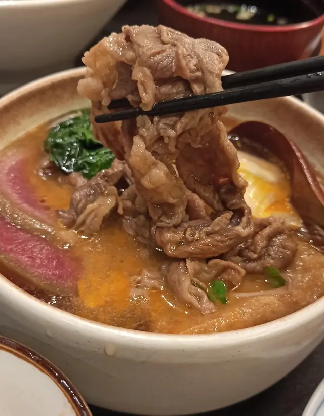 老表份鍋物定食睇落都好吸引,宮崎黑豚肉大大鍋,份量真不少,而且,啲豚肉好嫩口,又唔會話好肥,鍋底仲有唔少洋蔥、豆腐皮、野菜……等等,至於個昆布柴魚湯味道清香