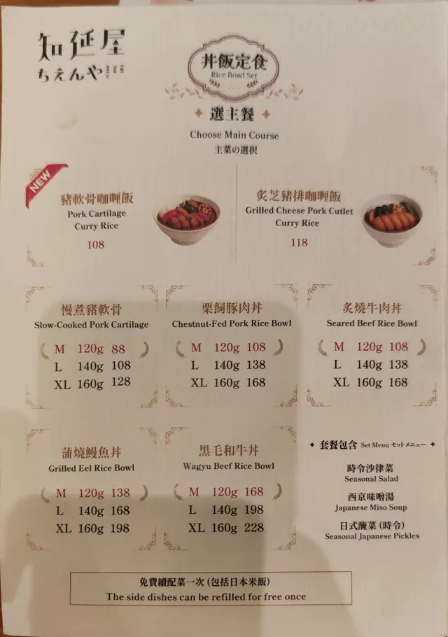 老表剛去完台北一行,話有啲拌手禮醒俾我,順便約出嚟食餐飯,佢就我,所以,就過到嚟中環呢邊聚一聚,中環食飯一向唔易搵位,故此走上少少嘅「歌賦街」,到訪「知延屋」食餐日式丼飯。雖然門外有少少人等位,但剛好上一輪嘅客陸續離座,我哋好快有得入。裝修簡約,但一室深色木系枱櫈,加上牆上吊燈,有種日式嘅懷舊風:);枱上嘅玻璃杯,更喺滿滿日式復古風格。餐廳主打喺丼飯定食、鍋物定食,前者款式不少,並分唔同嘅份量,豐儉由人