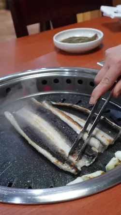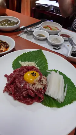 这家尖沙咀传统韩式餐厅,开业逾十年仍保持高水准。门面低调,登上二楼却别有洞天——木梁韩屋设计、古雅灯笼与传统桌椅,瞬间彷佛置身首尔老店。店员精通广东话且态度亲切,更有韩国籍员工坐镇,由落单到烤肉全程专人服务,连食法都细心指导,体验满分!店员奉上十款每日手制小菜,薯仔、芽菜、菠菜、泡菜、黑豆等。最惊喜的还有蛳蚶。〖韩式酱油蟹〗蟹膏丰腴呈橘红色,咸度刚刚好,不掩鲜甜。蟹肉晶莹像果冻,店员将人为我们搭配紫菜拌饭,让我们吃得很满足。〖韩牛板腱肉〗雪花纹理细密均匀,炙烧时肉汁锁紧。店员还教我们三种食法:➀ 喜马拉雅玫瑰盐提鲜➁ 现磨山葵激发辛香➂ 金蒜片夹击浓郁油脂牛肉入口即化不腻,尽显顶级牛肉本味。〖现烧鳗鱼〗鳗鱼外皮金黄酥脆,肉质厚实饱满。店员推荐我们以芝麻叶包裹,夹入甜洋葱与葱丝,再蘸特制鳗鱼酱甜咸交织,韩国直送配料更地道。〖金奖五花腩〗店员专人炭火慢烤至焦糖化。生菜包裹时加入泡菜蒜片,脆爽不油腻。店员又教我们点不同酱汁,每样酱汁都非常惹味。…查看更多