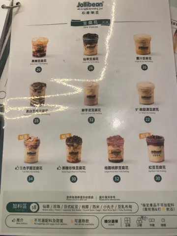 ,严选A级加拿大黄豆,研制出新鲜健康的豆乳饮品,高营养又抗氧化保留新加坡傅统小食,更揉合香港地道特色风味Jollibean 因季节都会推出期间限定款,最近出咗开心果豆乳、猪仔包、及牛角酥全部吐司免费升级香脆猪仔包, 加$5可以转7吋牛角酥,各分店不时会有甜品/饮品加购优惠每天行出户外都已经热辣辣,睇到豆冰乐系列几透心凉我又钟意饮豆乳味道嘅饮品