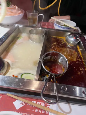 我哋入到去一坐低就即刻叫左个鸳鸯锅汤底我哋就选择咗牛油红锅(小辣)同埋大骨百味汤锅 (一个就重口味 一个就清淡d)