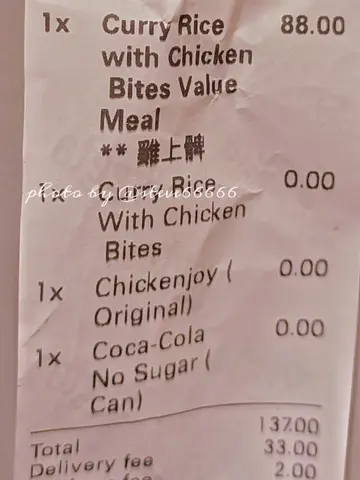 这次透过外送平台点了 Jollibee 做晚餐,有惊喜也有些少失望:咖哩酥脆鸡饭套餐(跟4件鸡块,1件乐趣鸡,1罐无糖可乐)(⭐⭐⭐)咖哩酱一团一团偏粉感重、香气不足,像是快餐式即溶酱,没什么层次。4件鸡块肉质不错但外皮不脆,略软,外送后口感明显下降。跟餐既原味乐脆鸡(⭐⭐⭐⭐)建议下单时要注明要鸡上脾,肉质嫩滑且油脂分布平均!虽然可能太夜叫喺餐厅里放耐咗,唔够热且带轻微湿软,但外皮依然算得上酥脆金黄不过咸,嫩滑既鸡肉咬开后肉汁丰富,肉质不干柴,有「啖啖肉」的满足感。就算失准乐脆鸡都不会差到那里去。轻怡沙律 (⭐⭐⭐⭐⭐)够冻!够冻!够冻!外卖送到嚟依然够冻,估不到会比正餐好吃的...... 蔬菜新鲜爽脆,粟米香甜,完全没有那种廉价生菜的青味,诚意十足,沙律酱另上的,酸酸的可按个人口味落。作为快餐店的沙律有惊喜,下次会再叫!香芒蜜桃批 (⭐⭐⭐⭐⭐)个人认为是招牌必点,外皮炸得酥脆,内馅芒果与蜜桃酸甜平衡,甜度适中不腻口,让人想再点一个。应该是放了一段时间,有回油情况盒面吸了不少油,但外皮依然没出现湿软情况,推!评分总结:⭐⭐⭐✨(3.8 / 5)…查看更多