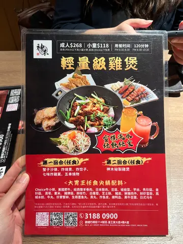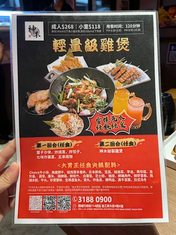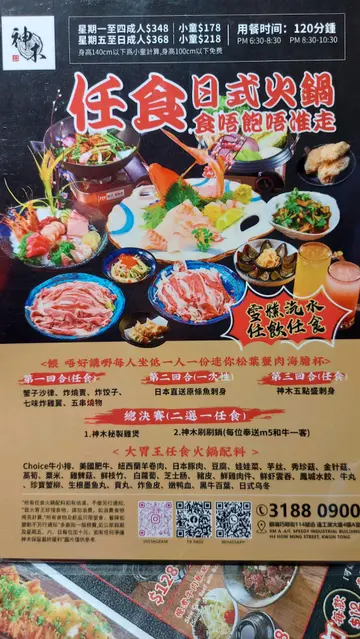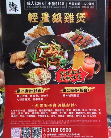 同朋友庆祝生日就当然要揾啲舒服又抵食嘅餐厅,上网揾到系观塘工厦入面有间做紧"任食日式火锅放题 ",见介绍都唔错,所以就锁定嚟食返餐兼聚一聚。店内里装修都好精致,好有日式居酒屋嘅风味,环境几大坐得舒服,而且仲有室外地方添(早知就带埋狗狗嚟陪食啦)。我地今次拣左 轻量级鸡煲 ,系用餐时间120分钟内就任食同任饮。任食方面就系以一回合咁计,即系任食完一回去下一回时就唔可以叫返上一回合嘅食物。饮品嘅种类都几多,连啤酒都有得提供呀!先黎第一回合 就系以小食同沙律菜为主,先嚟重份量嘅清新蟹子沙律,然后就由厨师安排嘅五串烧物同炸物。炸烧卖、炸饺子、七味炸鸡翼同埋五串烧物就有鸡皮、鸡肾、鸡软骨、蕃茄、京葱,全部都系即刻炸/烧,所以食起嚟热辣辣,而且味道都刚刚好,所以唔错。前菜之后就到第二回合,即系焦点所在 神木秘制鸡煲,份量比想像中足料,鸡肉好嫩滑,而且佢个酱汁味道刚好,食落特别惹味。最后就加汤去到第三回合,即系任食火锅,配料选择都有好多,我地点左肉类方面我地点左熊本豚肉、美国肥牛同埋饺子、芝士肠、菇同菜类(其实仲有啲云吞、水饺同牛柏业,不过就挂住食忘记左影相..哈哈)。火锅食材质素都唔错,入口好新鲜,所以我地都来来回回食左好多转,食到好饱饱呀!最后就当然唔少得食返粒雪糕啦!…查看更多