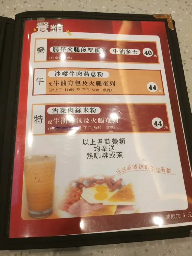 這裡的常餐叫做午餐沙爹牛肉可以轉豬扒大光麵,米粉,通粉,意粉都試過奄列可以轉炒雙蛋牛油方包轉多士加1蚊牛肉淋滑 沙爹汁濃而不膩屯門友說喜歡它比較甜全香港也吃不到這味道會令人念念不忘偶而會有一兩次失準通粉太糊或炒蛋太老但茶是調得很好的香濃澀出色的香港地道風味下午茶鐘數有蛋撻出爐聽到呼喚就要點 很多捧場客很搶手屯門友說炒野味道好有鑊氣小菜有點貴但是很足料有水準只有一次點的焗飯有點燶味吃好東西有時看一點運氣~…查看更多