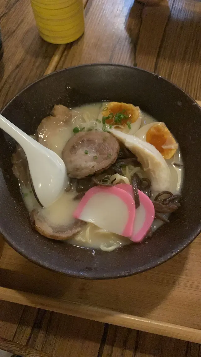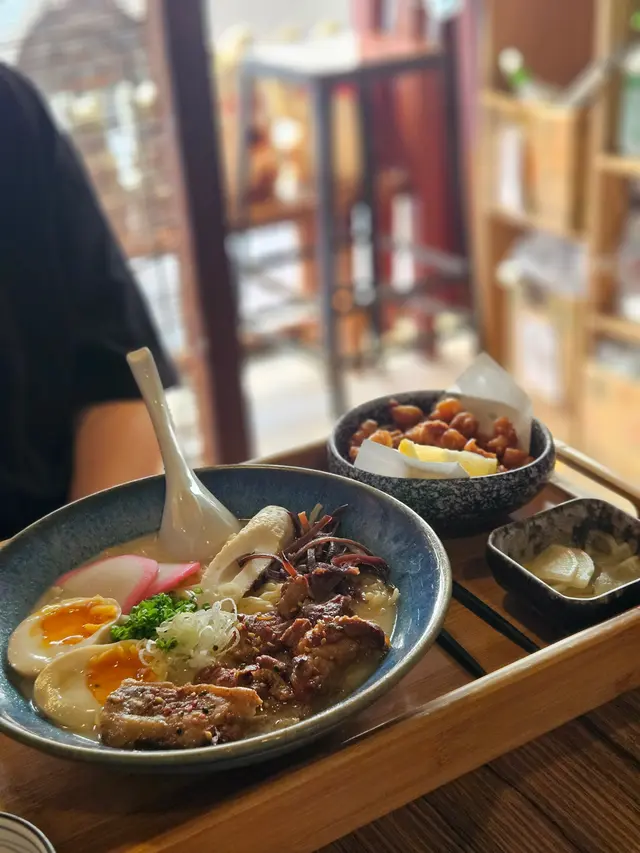 與朋友逛完花墟,花園街尾有一間食日本拉麵,店舖不是很大,餐廳裝修好有氣氛,座位坐得舒服,由於12:00先開始營業,我哋做咗第一個顧客叉燒拉麵:面質非常好食,材料好豐富,除咗日式叉燒,溫泉蛋,還有多塊像魚旦的東西,湯底調得好味,味道不錯。👍🏼👍🏼餃子:皮煎得香脆,可以說皮薄餡靚蒲燒鰻魚飯:前菜、沙律、茶碗蒸、麪豉湯,好多唔同種類蒲燒汁配鰻魚,好夾,鰻魚做得好好,份量大啲就完美👍🏼👍🏼查看更多
