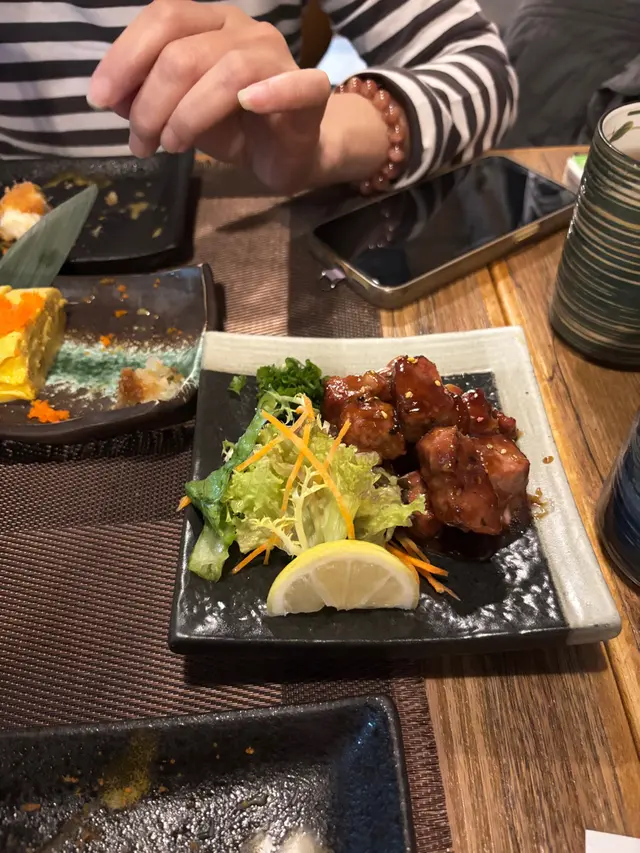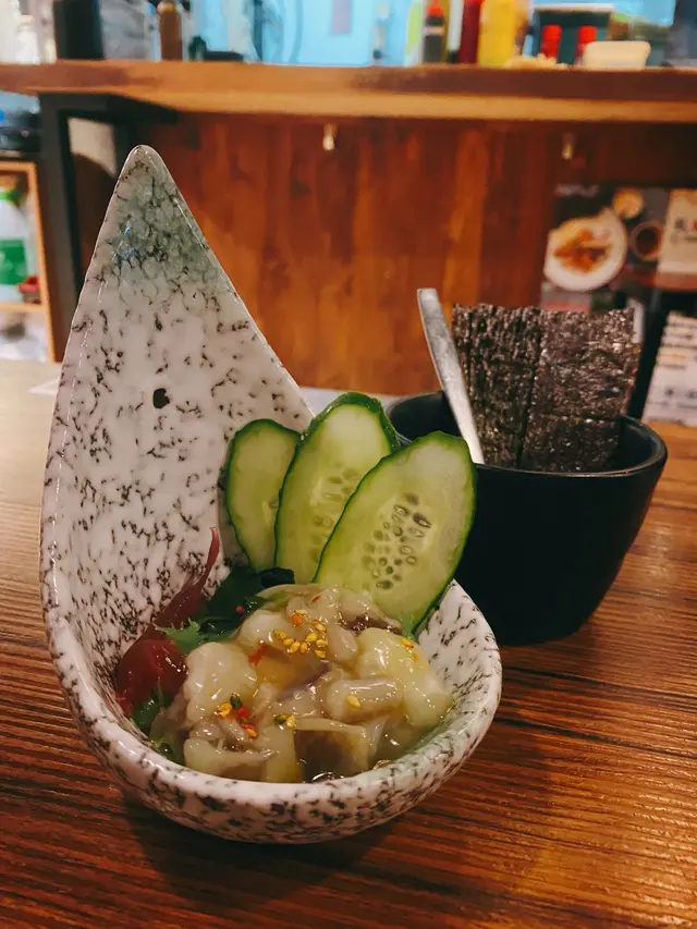 位於太子花園街,有一間用心經營的居酒屋,想不到麻雀需小,五臟俱全,小小的店舖竟能煮出各式各樣高質的食物。串燒、刺身、卷物、炸物…… 選擇非常多,而且還很美味呢!店內裝潢及擺設以深色木材為主調,採用木桌木椅,充滿日式居酒屋風味。🍒黑松露枝豆 $48加了黑松露的枝豆,味道立即提升了。🍒古早蟹籽沙律 $58沙律菜新鮮,加了沙律醬和蟹籽,味道豐富。🍒秘制半熟鰹魚他他 $118半熟鰹魚他他配上蔥絲、茗荷絲、洋蔥粒和秘制醬汁,鮮味爆燈。🍢 免治雞肉棒配醬油蛋 $48🍢 雞軟骨 $32兩串都各有特色,雞肉棒點上蛋汁,香中帶甜。雞軟骨香脆可口。🍒高湯玉子燒 $78玉子燒很厚,蛋味香濃,清甜之餘更是滑不溜口。🍒慢煮紅酒牛腩 $88蘿蔔牛腩軟腍入味,散發著淡淡的清甜和紅酒味道。🍒鹽燒一夜干 $108「一夜干」源自日本北海道保存魚獲的方法,把魚洗淨後用鹽水浸泡,在冷風中進行一夜的風乾,魚肉紮實富口感,鮮味依舊。🍒明太子油揚豆腐 $78油揚豆腐外脆內軟,上面鋪了一層厚厚的明太子和蔥絲,更加滋味。🍒芝士年糕 $48煙煙靭靭,芝士味濃郁,食一粒已很滿足。🍒月見醬唐揚飯團$48很有特色的飯團,外皮香脆,口感像飯焦,裡面是混合了月見醬的飯,加埋蛋漿,又靚又好食。查看更多