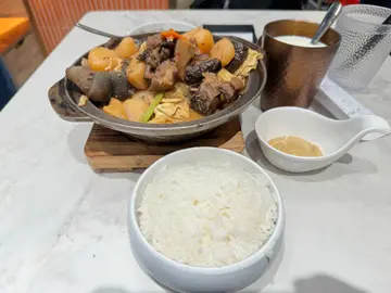 第一次过嚟食咗个黑椒汁板煎T骨牛扒拼辣肉肠饭,T骨有骨是正常,我明白,但系旧肉得BB手咁大。。。。筋骨同肥膏就大把。有啲失望,小女两啖食晒,好彩有条肠送下饭🥲…查看更多