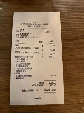 最近跟另一半庆祝纪念日,选了屯门秋香,这家日式居酒屋装潢简约日风,木质桌椅配柔和灯光,氛围温馨适合情侣和朋友聚会。我们点了「厨师推介二人餐」($698),整体丰盛新鲜,性价比高,值得推荐!套餐的开始是是日餐汤和日式开胃菜,是日餐汤是日式面豉汤非常暖胃。接著日式开胃菜,包括五色海藻,脆脆清新,配酸甜酱汁解腻。秘制蛋黄酱烧蚝是亮点,蚝子肥美,外脆内嫩,蛋黄酱很香浓,蚝汁爆汁超满足。炸物拼盘选了鸡皮饺子和盐酥鸡。鸡皮饺子酥脆油香,内馅鸡肉蔬菜;盐酥鸡金黄椒盐风味,热腾腾不腻,适合配饮料。我们点了招牌Cocktail「含笑半步钉 - 唐伯虎」(蜂蜜川贝桔梗琴酒,$98),味道独特,蜂蜜甜中带中药香,琴酒顺口不烈,喝起来像在看周星驰电影般有趣!另一杯是无酒精的「金橘柠檬青柠梳打」($38),清爽酸甜,气泡解渴,完美配炸物。串烧盛:牛肋骨软嫩多汁;日本黑豚肉肥瘦适中;菠萝甜酸解腻;采葱烟肉卷烟熏浓郁;鱿鱼串辣烧弹牙微辣。整体炭香新鲜,调味均衡。盐烧白鳝煲仔饭底层有饭焦,非常香脆,鳝片厚厚的,盐烧突出原味,拌匀香气四溢,两人分饱足。精选甜品:朱古力蛋糕朱古力味很浓郁不甜腻,圆满收尾。整体来说,秋香服务非常亲切,上菜快,环境干净,下次要带同家人再来尝尝其他食物!…查看更多