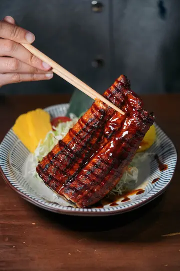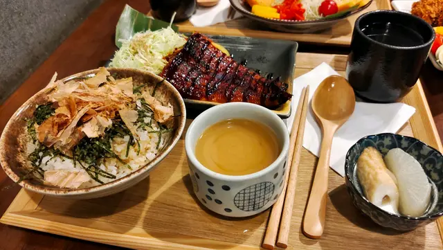 朗屏站附近有间日式小店,步行3分钟就到达,主打日式定食,小店座位大约得14个。半开放式厨房,不觉有油烟味,推门入内被墙上一大幅漫画角色嘅画吸引住,当中有龙珠,海贼王,鬼灭等,d回忆返晒嚟🤪 午市定食均配:前菜,煎茶,味增汤,珍珠米。 可+$10转茶渍饭/汤乌冬/特色猫饭。另可+$10追加自家制糖心蛋 🔸️猫饭有紫菜+木鱼花+日本酱油+牛油,捞埋一起超级好食😍值得加$10转🐱饭😋 🔸️茶渍饭有紫菜+木鱼花+饭素再配上高汤味道清新好味😋 🔸️招牌蒲烧鳗鱼定食($78 )大大条上枱够晒大方,厚肉得嚟肉质软嫩,蒲烧汁浓郁甜甜地送饭一流。另加糖心蛋,浸得刚好不会过浓味,流心口感一流。🔸️香煎和牛汉堡扒配咖哩汁定食($84)汉堡扒可选7成或全熟,我地选了7成,切开似8-9成熟了点,不过牛味香浓油脂充足,配上日式甜咖哩嘅很好送饭🤤 🔸️飞驒和牛可乐饼$58。炸得好出色,外面酥脆可口一d都唔觉油腻感,馅是绵滑薯蓉加香浓的飞驒牛肉非常好食😋 十分欣赏每道菜都有椰菜丝,食埋椰菜丝感觉上健康返少少😆整体食物质素及份量都很好,价钱合理无加一服务费,服务态度亦很好,值得推介朋友一起再来😋…查看更多