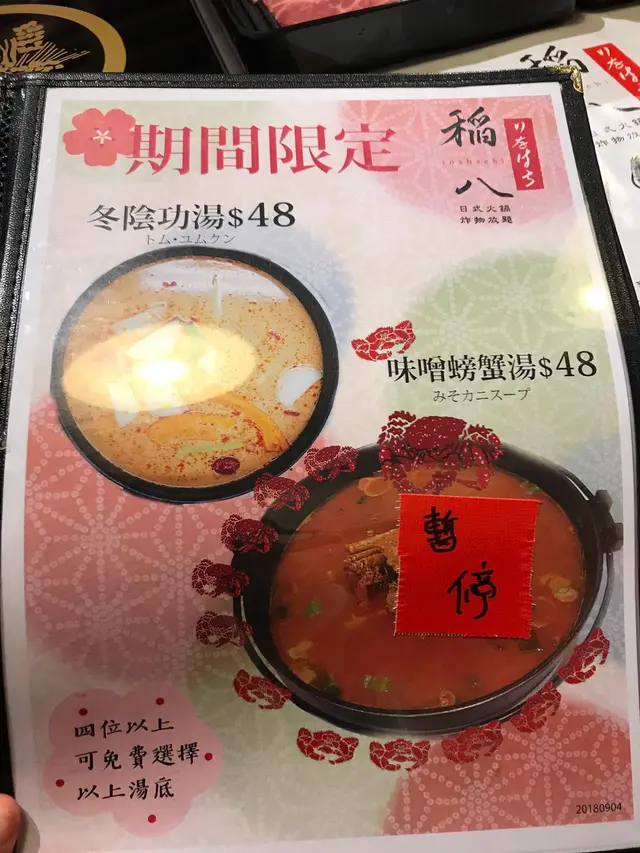 今日同媽子去荃灣行街,行到肚餓緊係揾下野食,睇唔出媽子係荃灣咁熟,佢帶我揾食,真係唔係佢帶我去都唔知,原來富利達中心1/F有間火鍋,叫"稻八日式火鍋",上到去發現地方好大,好寬闊,唔會好似其他放題咁,枱貼枱咁迫,坐得好舒服,坐低左緊係睇下食咩同叫邊款湯底,有6款唔同價錢,我地最後揀左中等價錢$208/位任食,最重要有我最鍾意食既羊肉再揀湯底,我叫左個毛蟹冬蔭公湯底,聽個名都知特別,一黎個湯底,飲一啖,甜到呢,可能關個毛蟹事,d冬蔭又剛好,唔會太辣太酸,arm我地口味湯底黎到,原來佢地會先自動拎一份牛,2份豬,2份羊,1份雞,唔係cheap野,都有水準d丸,菜都係正常種類 但菜好新鮮仲有d特別野,就係自己炸天婦羅,好好玩,仲有6種調味粉選擇最後仲每人送一杯貴價雪糕,完美查看更多