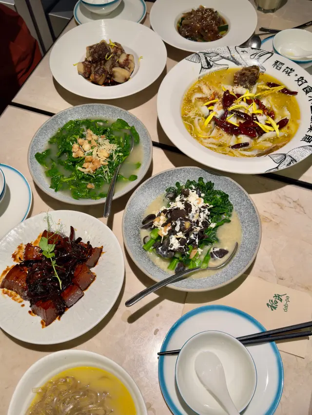 行山结束友人想吃酸菜鱼,选择稻成一试。酸菜鱼味道鲜美,鱼片嫩滑不失脆嫩,酸菜口感爽脆,酸度适中。意外之喜是又有烤鸭售卖,烤鸭皮酥肉嫩,搭配黄瓜京葱面酱卷荷叶饼,唇齿留香。熏比目鱼做法与上海江浙较为不同,鱼块并未浸透酱汁,口味稍腻但不似原版之甜,各有千秋。花菜干香,辣度适中。前菜质素也都不差,算是用心。餐厅环境稍显拥挤,晚餐时段基本客满,有点嘈杂。总体而言,食物味道上佳,人均200左右,价格公道,服务态度好,很值得推荐。…查看更多