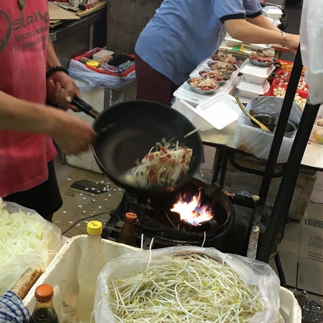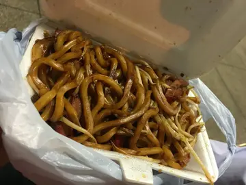 之前搭车经过见佢有人龙,有晒镬气,唔知味道如何呢?是日晚饭没有著落,当然去试下啦!无我钟意的濑粉,就叫咗公仔面,要火腿、红肠同鸡肉做𩠌。之后先发现可以"大杂会",佢就咩料都落D,早知我就唔伤脑筋谂咩𩠌啦。落油炒香D洋葱,跟住落𩠌再炒,再落一"住"芽菜继续摩打手咁炒,落面后整松继续炒,抛几下镬就落豉油,炒多几下就成事入盒。由落镬到入盒不到五分钟,应该可以入健力士!色,香都有,味道如何呢?返屋企即刻品尝,可能俾个盒焗住咗,个面自己开始黏在一起,用筷子都好难整散,味道亦偏淡,胜在食饭前有场表演睇下lor。