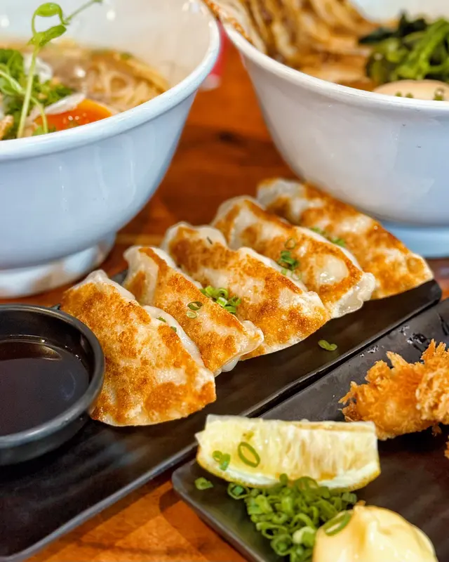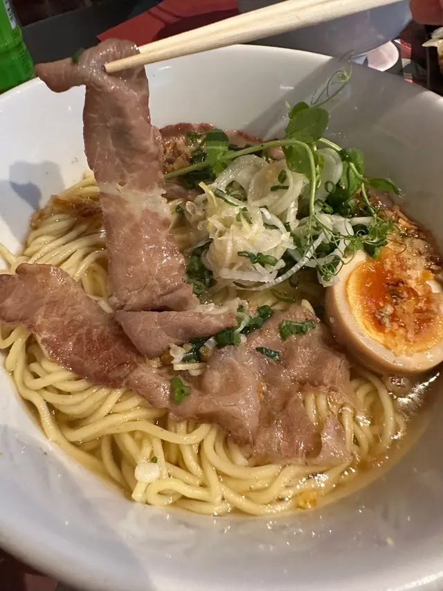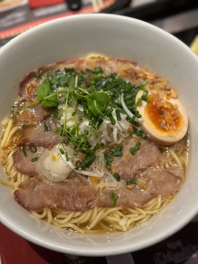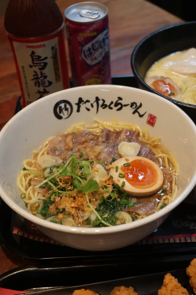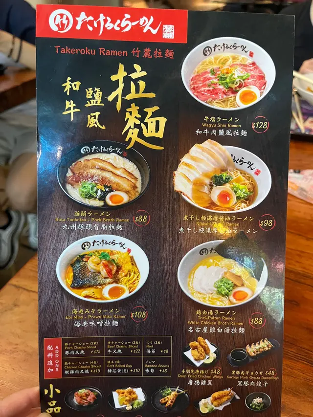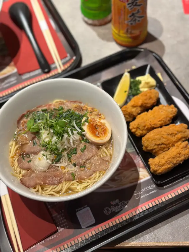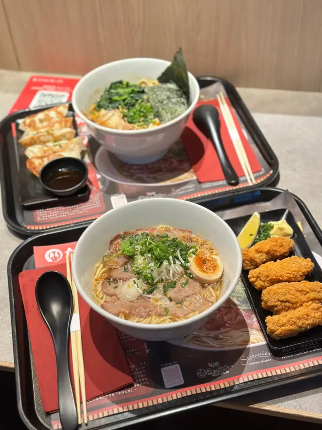 中環街巿裡美食種類多,我和朋友看見一間日本拉麵店<竹麓拉麵>。開放式廚房,看見廚師用心製作拉麵和準備配料。餐廳主要提供5款拉麵,價錢由$88至$128,配料可追加。小品/小食也有7款,可選菜和肉,價錢由$18至$48。飲品類可選樽裝$16和罐裝$12。我們便決定在這間拉麵店吃晚餐,點了兩個拉麵餐,毎個餐加配小食和飲品。分別是👉1. 和牛肉鹽風拉麵、黑豚肉餃子和樽裝麥茶👉2. 海老味噌拉麵、炸吉列蝦和樽裝麥茶。👉和牛肉鹽風拉麵、黑豚肉餃子和樽裝麥茶湯底濃郁,充滿著和牛、香蔥、炸蒜味道。半隻流心蛋、四塊和牛;拉麵粗幼和軟硬適中,帶點嚼口。黑豚肉餃子,共有5件,外皮煎得香脆,內裡黑豚肉肉質滑溜,且帶有肉汁,非常美味。👉海老味噌拉麵、炸吉列蝦和樽裝麥茶橙色湯底,有著鮮蝦和味噌味道,湯底較濃稠。半隻流心蛋、三件彈牙鮮蝦和一塊香脆炸魚皮。炸吉列蝦,共有三件,炸漿薄,香脆可口,蘸上美乃滋醬和檸檬汁很好吃。樽裝麥茶~眾多飲品中選擇了麥茶,皆因麥茶有助消化又利尿消腫,吃完拉麵喝一樽麥茶,的確很不錯選擇。…查看更多