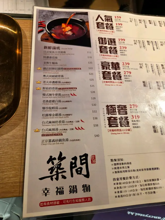 最近同朋友去咗築間幸福鍋物試下佢哋嘅極奢放題,一人$319, 價錢都好合理最驚喜係佢哋嘅湯底,叫左個鎮店招牌石頭湯,另外老火淬濃雞湯都係一絕,濃郁到入口都係陣陣雞香味。下次會再想試吓正宗嘅砂鍋魚湯出邊都會有自助bar, 感覺非常之乾淨企理亦都有大量嘅蔬菜同埋唔同嘅台式配料選擇講到海鮮,一定要推介海潮鮮鱸魚同埋龍躉石斑魚片,肉質新鮮彈牙,放落滾湯嗱一嗱就食得,魚肉超嫩滑!海虎蝦同鮮蝦都係必食推介,個頭大大,肉質爽甜,配埋個湯底超正!至於三文魚片就油香十足,肥美嫩滑。各款海鮮包括沙白同鮮蚵都好新鮮,特別係個鮮蚵,鮮甜多汁,一啲腥味都冇。肉類方面,美國熟成霜降牛同澳洲黑毛和牛霜降簡直係極品,肉質超嫩,油花分佈均勻,一入口即溶!冷藏手切溫體牛新鮮度一流,肉味香濃。伊比利黑豬梅花同松阪豬都係精選,油脂豐富,肉質軟嫩多汁。最後dessert環節都唔馬虎,黑糖白玉奶酪香濃滑嫩,草莓同芒果奶酪都好有水準,果香濃郁。焦糖布蕾表面焦脆,入面滑嫩,甜度啱啱好。整體食物嘅質素都好好,唔怪之得係台灣可以咁出名…查看更多