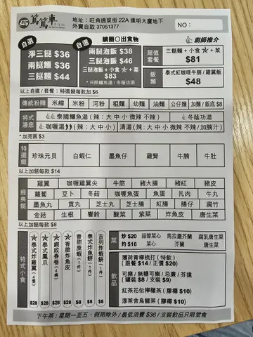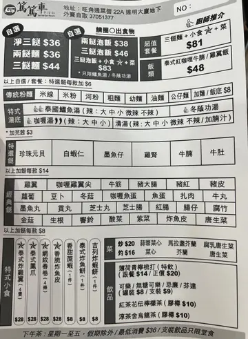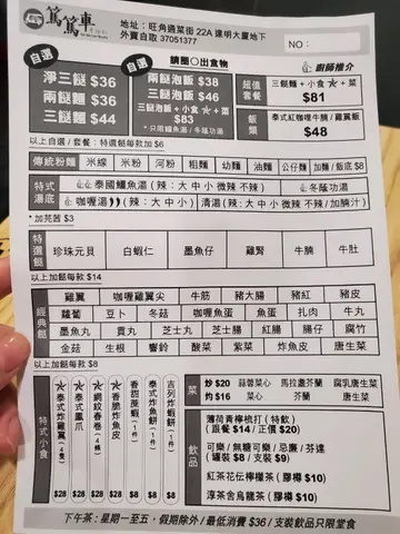 去开旺角行街,肚饿路过见到有个泰式车仔面几抵食就入咗去食。叫咗两个套餐$81 三𩠌车仔面+菜+小食三𩠌叫咗鸡翼、猪大肠同猪红。鸡翼同猪大肠都几入味几淋👍🏻猪红就正正常常。汤底要咗微辣鳄鱼汤,个味都几特别,好似都真系有少少鳄鱼味😂,辣到就谭仔十少辣到。菜要咗马拉盏炒芥兰,佢都似系即炒,味道偏淡,芥兰食落都新鲜唔苦小食要咗酸辣凤爪,份量都OK,系比较辣同埋好多都系断指😂$65 冬阴功炒饭 包罐装汽水炒饭都有镬气,但冬阴功味唔系太浓。不过都几足料,有好多细虾仁,啖啖都有肉😋。个饭入面有好多黑色镬蕉,我自己就唔系好钟意,感觉好似唔太干净😓整体卫生情况都尚可接受,有啲虫仔系到飞,但打开做生意佢系出面飞入嚟都冇计…查看更多