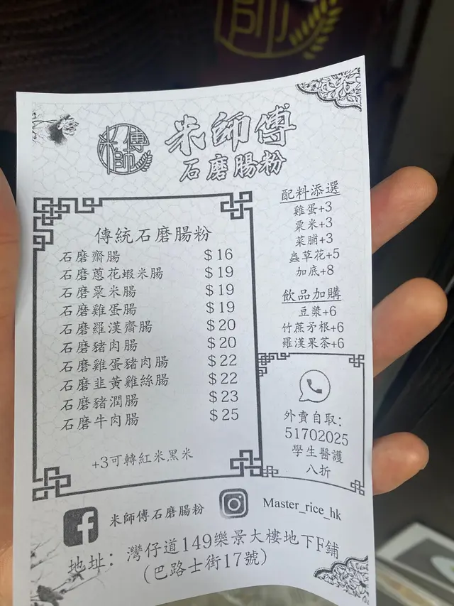 💛黃店📜”米師傅石磨腸粉 (灣仔)📍地址:灣仔灣仔道149號樂景大樓地下F號舖🤍分店地區: 灣仔📝評價💬📢 石磨腸粉一直都好想試呀 不過呢度冇得堂食要外賣拎走食 就有d麻煩😂😂😂😂又要趁熱食😋😋有得簡紅米定黑米 仲有得簡加吾加燒賣同豆漿做套餐👅雞蛋好香 配埋豬肉好有口感👍🏻👍🏻又好新鮮😍😍 燒賣係魚肉燒賣💛💛 豆漿更加係自家製💛🏵環境指數:⭐️⭐️⭐️⭐️🏵味道指數:👅👅👅👅🏵抵食指數:💰💰💰💰🏵回購指數:❤️❤️❤️❤️查看更多