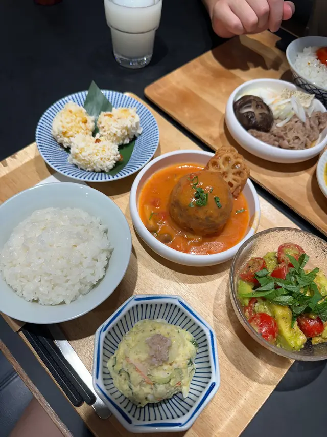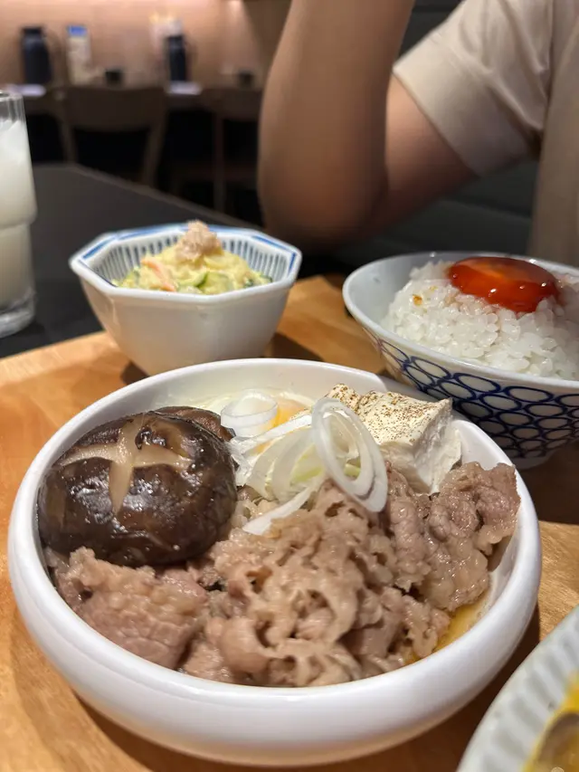 位於黃埔嘅人氣小店,晚餐時間排晒長龍。裝修以日式木系為主。餐廳嘅形式係自行組件唔同嘅菜式,然後放喺一個木盤入邊,呈現日式定食嘅樣貌。自選飯類:有唔同醬汁嘅組合👌🏼海苔醬飯:海苔醬比想像中甜好多,就好似將紫菜加咗糖整成好濃厚嘅味道。對於自己嘅口味嚟講覺得偏甜。至於白飯都整得粒粒分明。👌🏼醬油蛋魚子飯結合咗生蛋黃嘅濕潤質感,再撈埋魚子嘅鹹香,符合預期嘅味道。自選菜式::)月見博多地雞團子喺呢度嘅招牌菜,將免治雞肉撈埋雞軟骨,上面加個生蛋黃。口感味道就好似嗰啲日式雞軟骨雞肉棒,不過變咗一大嚿咁。雞肉撈埋雞軟骨嘅硬粒質感,整體口感味道都唔錯。:)日式吉列豬扒口感爽脆,唔錯。:) 蒜蔥燒牛肩肉卷牛肉頗嫩,有牛味,連埋啲蔥花食幾香口好味。👌🏼關東煮正正常常冇咩特別。