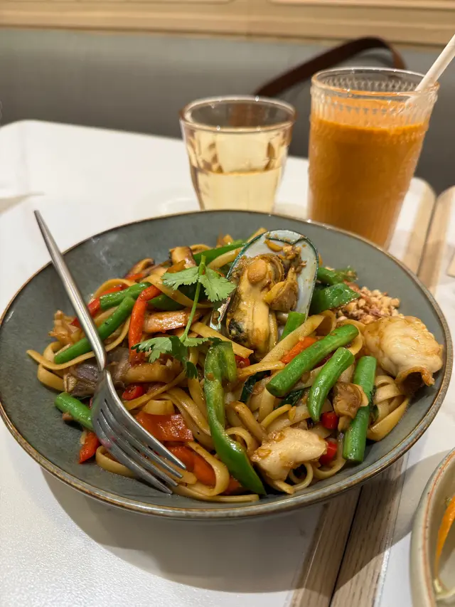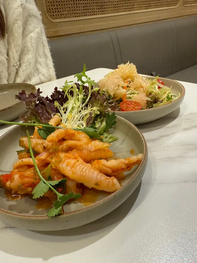 食物好味,CP值高,員工服務態度又好,還有是環境超好!點了兩個1人餐,前菜柚子雜菜沙律,調味微微酸,整個口感好清新!主菜是香辣海鮮炒意粉及泰皇咖喱大頭蝦配薄餅!香辣海鮮意粉,有青口,蝦,蜆及魚,足料,意粉是扁意粉,味道很好!泰皇咖喱大頭蝦配薄餅,有四還是五隻(忘記正確數量)蝦,每隻蝦都有咖喱汁,好Juicy。另外薄餅都好好味,又唔會太厚身,再配用咖喱汁食,正!還點了小食無骨酸辣鳳爪,個汁不會太酸,有啲辣辣地,鳳爪都好爽,好味!查看更多