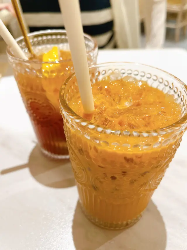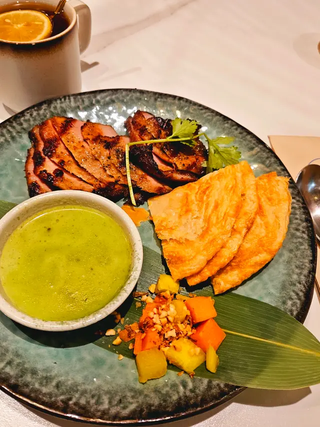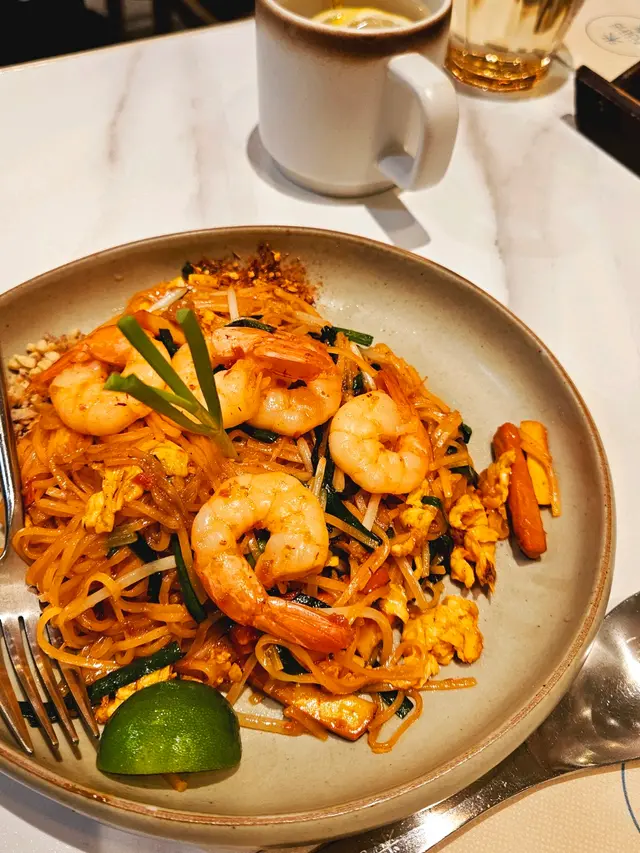 位於Megabox高層的米泰是一間泰國料理餐廳但整個環境走的風格卻是文青渡假風用淺木和白色作主調 很像Cafe整體環境很舒服這裡周末也提供午餐包括飲品 抵食👍🏻🔹️ 泰式豬頸肉配薄餅 $92一共有大約8-9塊燒豬頸肉新鮮烤的 肉質很彈牙 好吃可能迎合了香港人的口味這裡的青咖喱沒有我想像辣 反而薄餅令人有點失望質地比較厚實 不香脆口感有點像超市賣的沒有蔥的蔥油餅🔹️ 泰式鮮蝦炒金邊粉 $128份量十足  炒的乾濕度剛好加入鮮蝦、蛋絲、蔥等等令口感更豐富調味比較偏甜查看更多