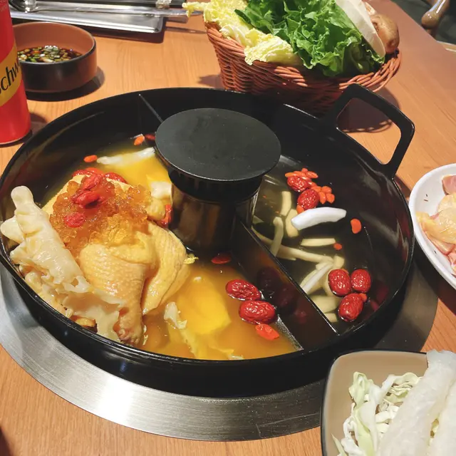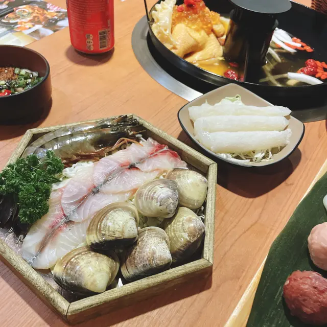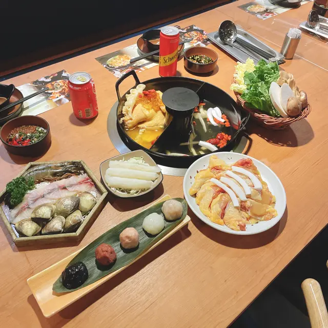 同老公週末想食餐好嘅補下,揀咗呢間空間感十足嘅和風火鍋店。一入去就覺得好舒服,樓底高,全場木系裝潢好溫暖🌳,柔和燈光唔會刺眼。最吸睛係一幅超大嘅牆身貼滿美食相📸,另一邊仲有啲得意日式海報,幾有特色。我哋坐咗近窗邊位,望出去幾開揚,環境好自在,啱晒兩公婆慢慢烚下烚下、傾下計💑。坐得舒服,期待開餐!食評時間:湯底、海鮮、手打丸樣樣試! 今次揀咗 「金湯花膠桃膠雞鍋」拼「椰子雞鍋」(雙拼係基本送清湯,但清湯我哋冇用)。* 金湯花膠桃膠雞鍋 💖💖💖💖 個湯底真係金金黃黃好靚仔!一滾起已經聞到好香濃嘅南瓜同雞湯味🎃,入口濃稠得嚟好順滑,花膠同桃膠份量都唔少,煮完啲料再飲碗湯,啖啖膠質感,好滋潤,老公話好啱補身! * 椰子雞鍋 💖💖💖💖💖 呢個簡直係驚喜!🥥原個椰青水做湯底,超清甜!滾起後落埋新鮮雞件,雞肉嫩滑,湯底更加鮮甜到不得了✨,我哋忍唔住飲咗大半煲先開始打邊爐!同金湯一濃一清,配搭絕妙。* 精選海鮮拼盤 💖💖💖💖 有蝦、鮑魚、蜆同魚片。全部都好新鮮🦐,尤其啲蝦夠晒彈牙,鮑魚仔烚完都唔韌。喺清甜嘅椰青湯底烚海鮮,更加帶出鮮味。 * 手打五寶拼盤 💖💖💖💖💖 必試!即叫即打真係唔同啲!🐷豬肉丸好香口;🦐蝦丸超爽彈;鮮墨丸好濃墨魚味;和牛丸牛味突出;最正係「烏卒卒」黑松露手打鮮墨丸🌟,一咬開濃郁黑松露香湧出嚟,墨魚肉又彈牙,口感同味道都滿分!真材實料。* 竹笙墨魚滑 💖💖💖💖 竹笙索湯一流,包住墨魚滑好有心思。墨魚滑打得夠膠,口感Q彈,竹笙增加咗爽脆感,幾得意。 * 鮮蔬雜菌拼盤 💖💖💖 蔬菜種類多又新鮮🥬,雜菌份量足,食咗咁多肉同海鮮,呢個拼盤好重要,平衡返。 * 可口可樂 🥤 打邊爐點少得可樂!夠氣!爽!服務員好有禮貌,介紹清楚。上菜節奏控制得好好,湯底先上,滾起後先上海鮮、肉丸同滑類,蔬菜拼盤最後上,咁就唔會搞到枱面太亂,亦確保啲嘢食唔會攤到凍晒。特別讚嘅係手打丸同墨魚滑都係逐樣上枱,保持溫度同最佳口感,趁熱食真係零舍好味!🔥 加湯都好主動,收10%服務費係合理嘅。今餐補身大餐超級滿足!🥰 金湯濃郁滋補,椰青湯清甜驚艷,兩款湯底都咁出色。手打丸真係高質,尤其黑松露墨魚!…查看更多