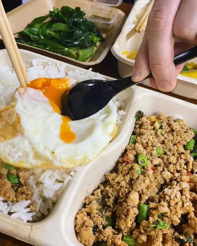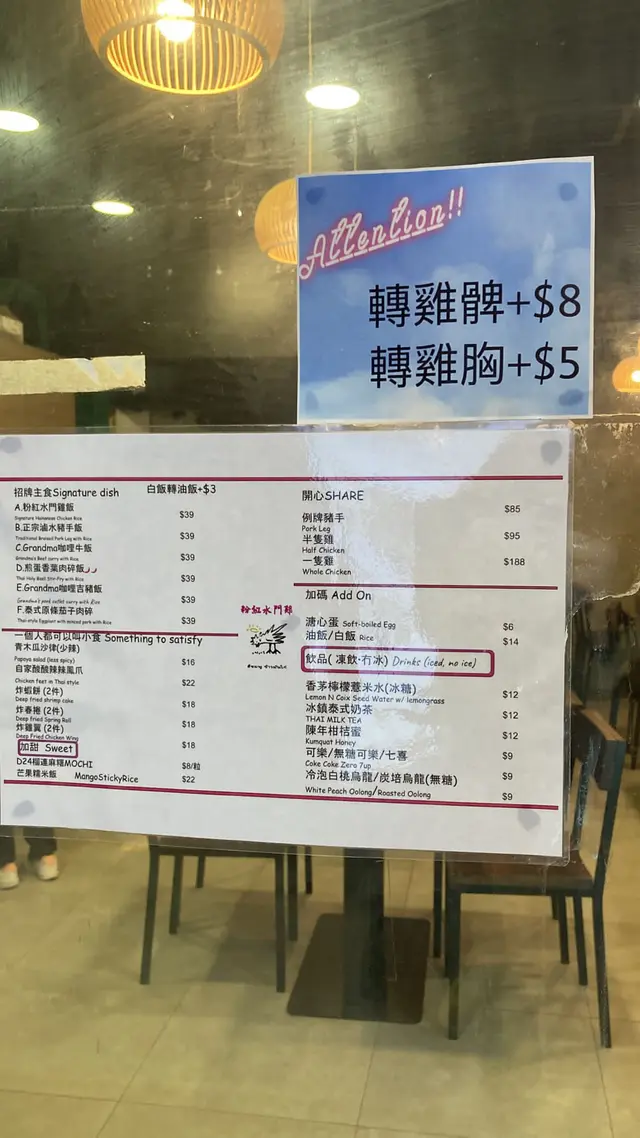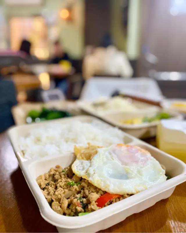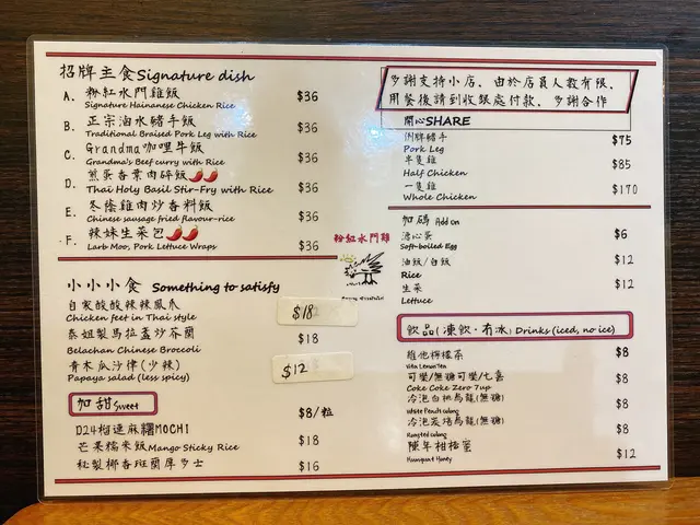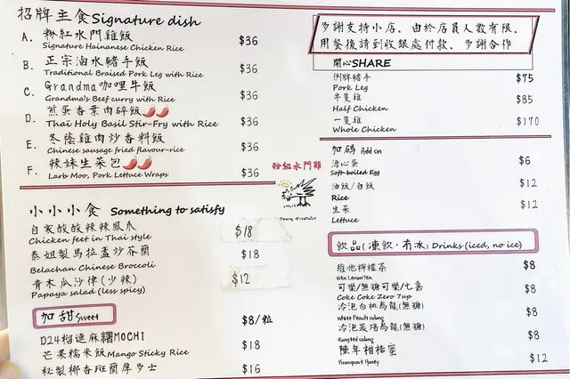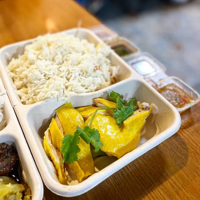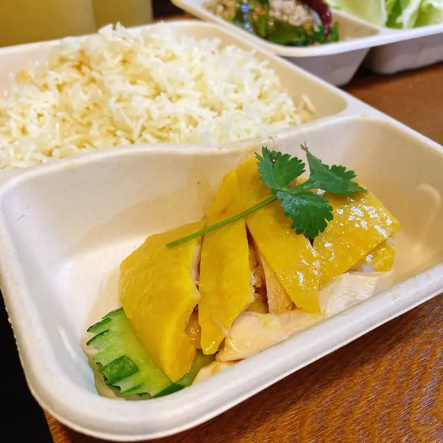 之前已經來了一次,被它的價錢、份量和味道吸引。知道他們menu加了很多新的餐單,迫不及待再去光顧🍽海南雞飯海南雞份量依然很多,而且肉質嫩滑,調味剛剛好。最欣賞就是它的油飯,可以看見大量的香料,例如香茅、洋蔥頭等等,所以每一顆飯粒都非常入味,而且不是單純的雞油而是非常豐富的香料飯。重點是超級多飯,男人都非常足夠。🍽泰式肉碎煎蛋飯這個是其中一個新菜式,本來以為平平無奇但有令人驚艷!雖然那一隔好像沒有裝到很多,但最後其實會不夠飯來伴😂豬肉碎完全不會很肥,而且真的蠻辣,不會因為香港人的口味而調成微辣。Basil香味很香,但是最後如果沒有白飯一起吃會有點鹹。煎蛋也是另一highlight,把蛋黃搓破跟飯和肉碎混在一起,多了一份creamy和蛋黃香🍽泰式無骨鳳爪這個鳳爪也是偏辣的口味,小小一杯有很多塊鳳爪,口感彈牙又入味,好吃😋🍽馬拉盞炒芥蘭超級多馬拉盞,鹹香味非常充足,芥蘭也炒得爽口,又不會太硬咬不開,只是略嫌比較油🥤冷泡蜜桃烏龍茶+金桔蜜烏龍茶聞上去很香蜜桃味,但喝下去沒有🙈可是2款飲料都非常透心涼查看更多