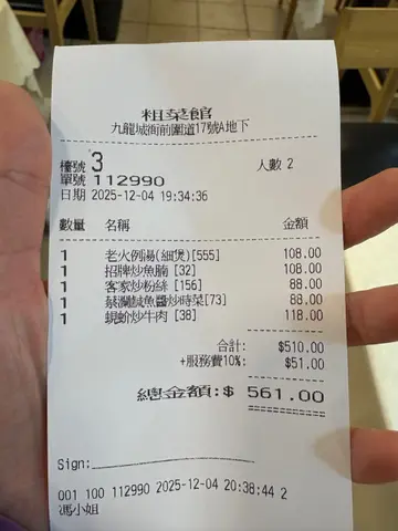 中菜如果你冇听过《粗菜馆》,真系好打极有限🤭呢度冇太多修饰花巧,唔靠噱头打卡,全靠真功夫同镬气🔥萤光卡纸手写菜式,镜面上密密麻麻嘅签名,多到数唔晒,好多都系熟口熟面嘅名字,已经默默说明咗粗菜馆嘅魅力✍🏼打开 Menu 第一页,迎面而来嘅唔系𩠌菜名, 而系同蔡澜嘅缘份🙂↕️ 多谢贵人赏识,佢地先可以由无名走鬼档,到喺九龙城落地生根超过30年出街食饭最挂住嘅,往往系阿妈煲嘅汤。粗菜馆就有呢股「人情味」。一坐低,姨姨已经亲切咁问要唔要煲汤🫰🏻老火例汤 - 粉葛赤小豆猪骨🍲去湿老火汤够晒足料🌽 上菜嘅时候成锅仲滚紧 ,出晒白烟,暖到入心♨️招牌炒鱼腩🐟要用十几斤重嘅大鲩鱼⚖️ 先切得出呢啲啖啖肉嘅厚鱼腩。外皮香脆、入面滑嫩,镬气十足。同炒猪杂一样系灵魂级招牌💫山楂酱排骨🍖外层几乎冇粉浆,但一咬落去依然脆口💢 果然系师傅功架!山楂酸香好突出,仲食到一粒粒嘅酸梅🍓 开胃又唔腻。惠州梅菜扣肉🥓梅菜扣肉就系要食肥,先够香😈 比例靓,晶莹发亮🪩 食落去又唔会油腻。梅菜够香又太咸,送饭一流🍚小炒皇🌱鱿鱼、虾、腰果、洋葱、青椒、韭菜,每一啖都食到镬气,完全喺老香港小炒嘅精髓🍳猪油捞饭🐷呢样系老一辈嘅集体回忆👵🏻 蔡澜本身就系「猪油界嘅最强支持者」,仲话系佢必吃清单之一✔️ 猪油热辣辣溶开、捞匀白饭🍚 一个字 正!蔡澜曾经讲过愿意同餐厅合照唔代表一定钟意📷 不过愿意提字,本身就代表一种认同🈵 红纸黑字,一笔落下,「天下美味炒猪杂」就成咗招牌🖊️每一道小炒都系心机同技巧嘅展现,嚟到可能会发现中菜一样精彩,唔一定系「老嘢」先食🤣…查看更多