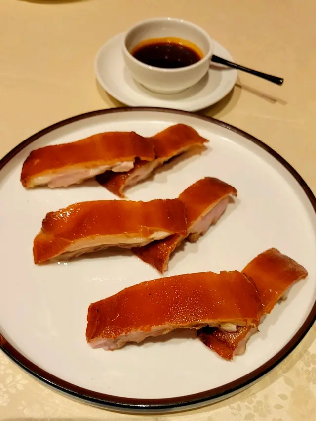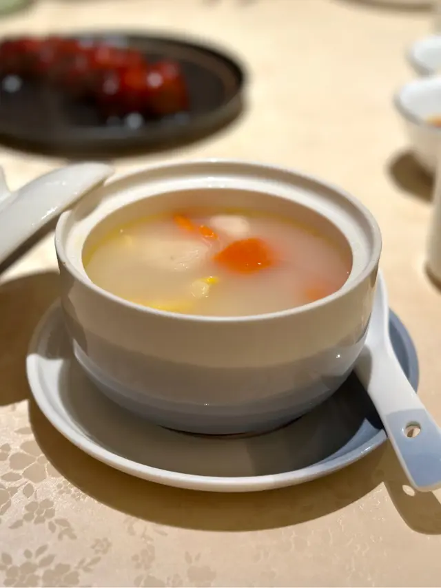 2025夏季香港餐廳周 HK restaurant week(7月29日至8月31日)剛開始,超過300間餐廳可以優惠價享用精選餐牌。小試牛刀,選了這間粤藝館,入到去發現同幾年前叫麒藝館入面的裝修一樣,只是改咗名。食咗Elite Lunch menu $248/位,等於了平時的午市套餐的五六折左右。第一道菜:點心(四選一)香茜餃第二道菜:竹炭脆豆腐第三道菜:西班牙栗子豬焦香叉燒第四道菜:粵藝老火湯(無味精)第五道菜:(二選一)宮廷一口咕嚕肉第六道菜:濃湯杞子百合浸菜苗第七道菜:櫻花蝦海皇炒飯第八道菜:粵藝特色甜品頭4道菜的上菜次序跟餐牌次序不同,先來叉燒、老火湯(紅蘿蔔粟米馬蹄豬展湯),再來竹炭脆豆腐及點心香茜餃,咕嚕肉開始的主食嘅次序就按餐牌次序出菜了。最喜歡的是咕嚕肉及櫻花蝦海皇炒飯,咕嚕肉的脆皮做得很脆、很香口,櫻花蝦海皇炒飯好足了,而且炒飯有鑊氣,唯一是偏油了一點。其他菜式就是一般般啦,唔係好差,但又未去到好出色。另外要茶水每位$25及小食$25,及+1服務費,埋單要$666。…查看更多