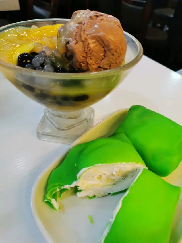 糖森林比較多特色款式嘅甜品食,價錢都唔會太貴。但唔係個個甜品都好食。鐘意呢間分店多d, 少d人,靜d。尋晚就試咗龍珠二世同榴槤班戟。等候時間都唔算太耐。 見有啲人話態度差,我諗係應該係個人style,唔係專登西你,就好似區內一間腸粉店老闆娘咁😂。不過尋晚唔係果個老闆番工,反而係幾位公公婆婆,都好NiCe. 唯一唔鍾意就係呢到會直接將隻匙羹放喺枱面🙉 每次都要鬥快接住,再唔係就用紙巾抹🙄。龍珠二世龍珠二世有龍眼,芒果,水晶珠,黑珍珠,雪糕同芒果沙冰底。雪糕有幾隻款揀,我揀咗朱古力,佢原配。 雪糕有朱古力粒粒係入面,都夠香濃。 芒果有啲酸,可能唔當造。不過加埋沙冰,一齊食都可以清晒既。 水晶珠卜卜脆,口感好得意。 黑珍珠並唔係普通珍珠,而係用黑糖煮過嘅珍珠, 好煙韌,咬咬下,啲黑糖味就滲出嚟,唔會好甜。 呢個組合幾好食,又有口感。 之前食過都係芒果類既清湖映月就好麻麻。 佢係由黑糯米,椰果,芒果,雪糕同紅豆組成。 咁嘅配搭冇咁好嘅口感中,同埋調味不足,成碗沙冰都冇乜味。 所以唔係個個甜品都好食。 榴槤班戟榴槤班戟面外皮好螢光綠😆好似平時都係咁既色?舖頭話係用D24榴槤肉製成。 見menu好多榴槤嘅甜品都係有D24榴槤肉。 諗起上次係松記食榴槤甜品,只係味得陣味又貴。 呢個榴槤班戟d cream都幾滑,中間有一嚿榴槤容,香甜好味😋。下次再黎可以試下其他野查看更多