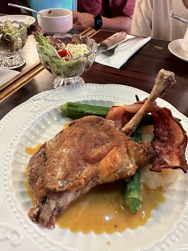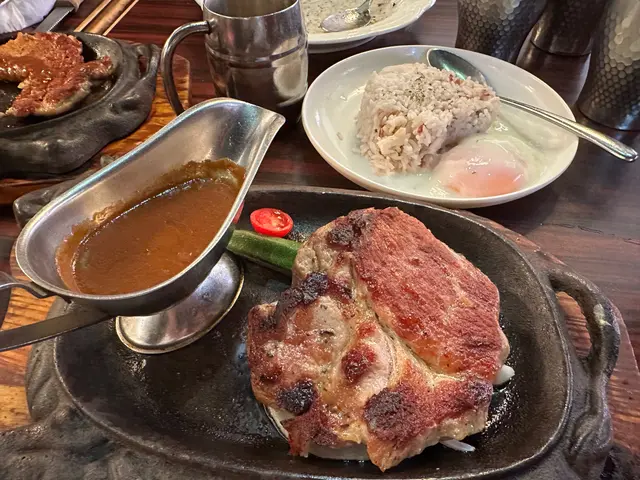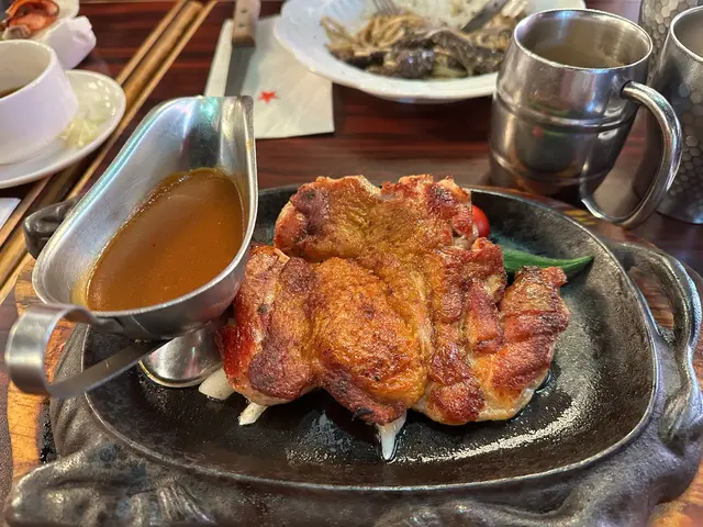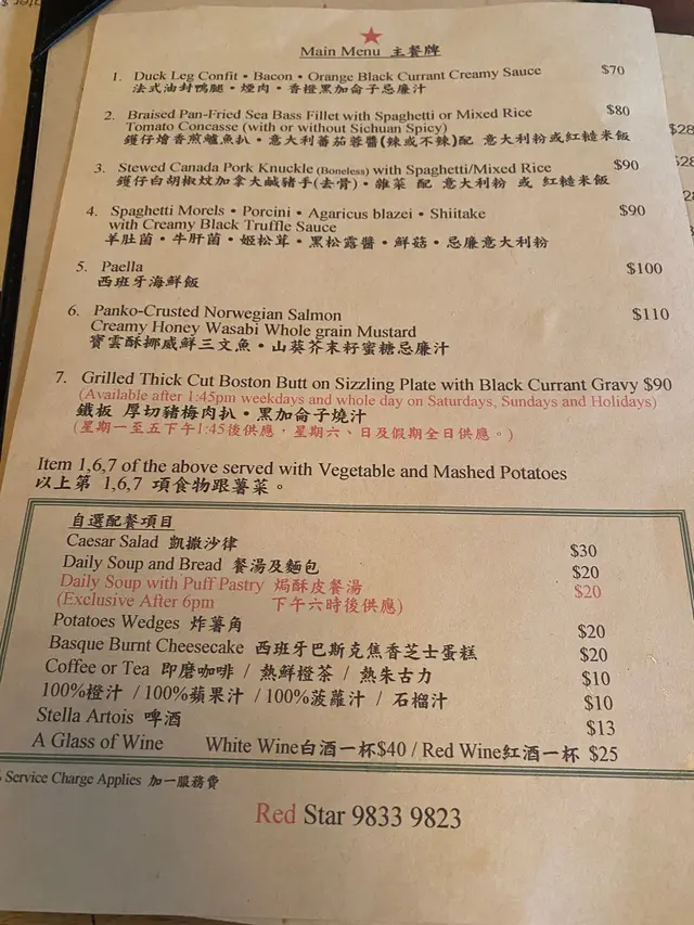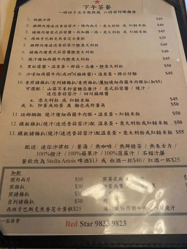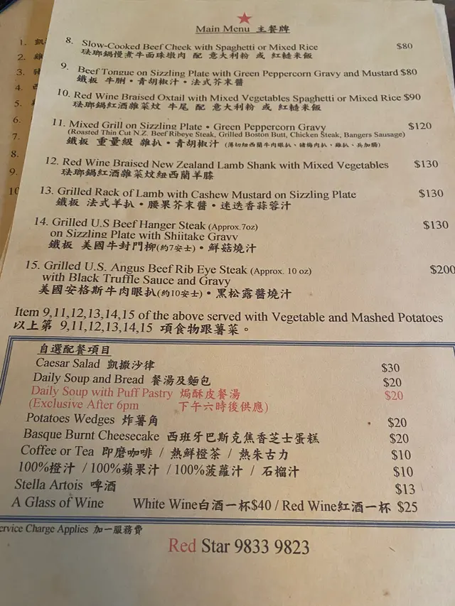 成日聽朋友講話有間懷舊西式餐廳好掂,終於約到時間一齊試。入到去滿滿的舊香港情懷,復古燈光配木枱木椅,瞬間穿越返70年代老香港西餐廳,氣氛滿分!款款都想試,最後索性豪啲,一次過叫咗成枱嘢。-🥩 鐵板美國牛封門柳(鮮菇燒汁)$130封門柳夠晒淋身,七安士份量啱啱好,肉味濃得嚟唔會韌。鮮菇燒汁撈埋薯蓉一齊食,-👑 美國安格斯牛肉眼扒(黑松露燒汁)$20010安士超大塊!肉眼扒脂肪分布靚,切開仲係粉紅色,黑松露燒汁超濃郁,每一啖都係奢華享受。呢個價錢好抵食!琺瑯鍋慢煮牛面珠墩肉配紅糙米飯牛面珠燉得夠耐,夾起嚟成舊肉都係入口即溶,汁收得夠靚,仲有隻溫泉蛋撈飯一流。紅糙米飯煙煙韌韌,唔會太硬,配埋個汁一齊食真係好啱。*update 5-course set $40 跟沙律杯、餐湯、餐飲、甜品🥗 凱撒沙律沙律菜新鮮爽脆,芝士味香濃,煙肉煙韌有咬口,加埋提子乾同沙律醬,層次豐富,開胃之選!🧀西班牙巴斯克芝士蛋糕表面焗至焦香,中間少少流心口感。芝士味濃郁但唔會太重,甜度啱啱好,係會想一食再食嗰種。呢間餐廳真係有驚喜,由主菜到小食都好有心機,唔會有啲行貨味。環境舒服,服務人員都好有禮。成晚食得超滿足,之後一定會再嚟,尤其係個蘑菇湯同巴斯克芝士蛋糕,實要encore‼️😛紅星餐廳 (北角)北角英皇道668號健康村2期UG樓UG10號舖…查看更多