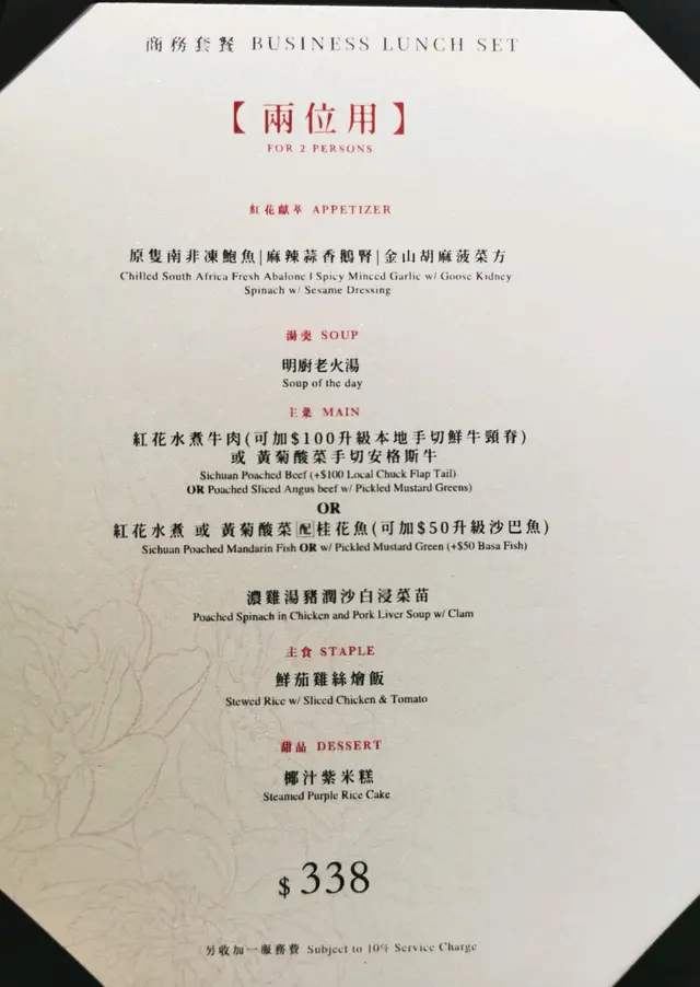 "紅花會"平日有商務午市套餐, 有二人/四人/六人套餐選擇, 埋單連茶芥加一服務費都是$400內, 與晚餐價錢相比, 平日商務午市套餐較為抵食😅前菜:原隻南非凍鮑魚, 味道非常入味, 凍凍的, 有咬口麻辣蒜香鴨腎, 夠麻辣味, 夠蒜蓉味金山胡麻菠菜方, 日式芝麻醬, 菠菜壓成方糖般可一口進食老火湯:蓮藕豬展湯, 湯碗內沒有湯渣, 非常夠熱, 味道很濃郁&清甜主菜:酸菜桂花魚, 桂花魚塊, 內有酸菜, 萵筍, 大豆芽菜, 薯粉. 薯粉質地好煙韌, 需要有點牙力才可咬開😁 另外真的要勁讚酸菜, 味道非常好, 亦可中和味蕾(解辣)😋👍濃雞湯豬膶沙白浸菜苗, 豬潤有點煮過火, 沙白脹卜卜夠新鮮, 菜苗充滿上湯味主食:鮮茄雞絲燴飯, 鮮茄雞絲, 味道真的鮮茄味, 味道酸酸, 炒飯底. 食完更飽肚😅甜品:黑糖黃金糕, 重黑糖味, 黃金糕一絲絲, 熱食味道更佳查看更多