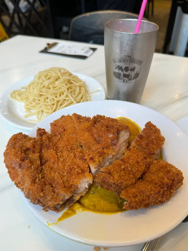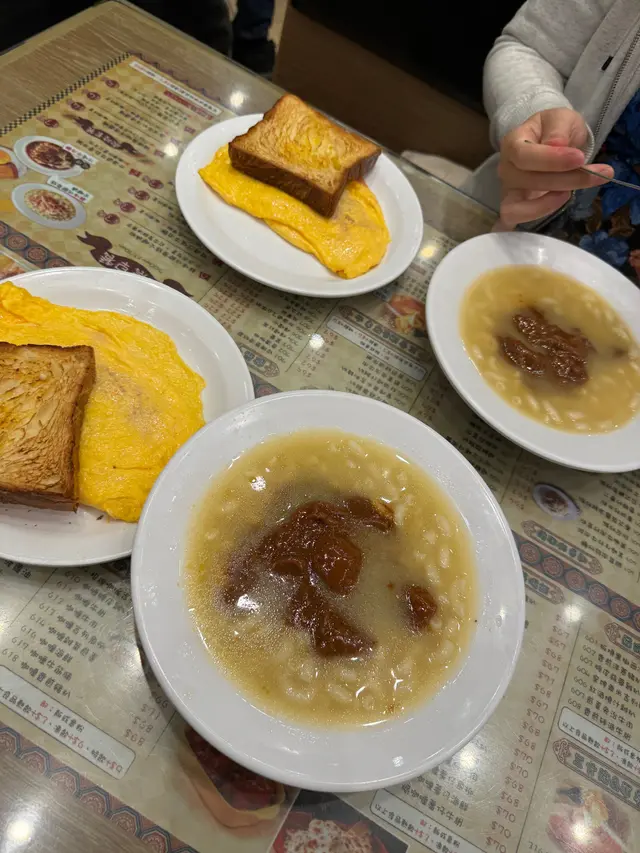 午餐時間路過觀塘,同朋友一齊食紅茶:)未去到門口,可能係午飯時間,條排隊人龍已經好長,大概30多人。不過其他餐廳就冇人龍😌大約10分鐘,我哋有位坐喇☺️係卡位。見到有d卡位枱,坐左7個人😅我哋都叫左特餐,因為佢嘅沙嗲牛肉好好食,不過因為我想飲埋啲湯所以就嗌咗通粉。特餐沙爹牛肉通熱奶茶$56一如預期係有好濃郁嘅沙嗲汁,呢種傳統冇紋嘅通心粉加埋啲汁好好食。個餐會送杯熱飲我嗌咗熱奶茶熱奶茶的溫度剛剛好,而且冇我最怕嘅臭奶味。好推薦。另外呢個餐會跟個牛油丹麥多士都係喺一啲公眾平台裏面被人廣泛推薦嘅。仲有火腿奄列其實都有隻碟咁大,加上全個餐都好美味,所以都算係性價比高。其實呢間嘢嘅其他食物都好好食,不過今次係兩個女仔,所以下次再嚟食其他嘢再介紹啦。查看更多