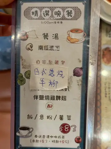 今次去红茶冰室食咗个套餐,包括南瓜汤、餐包同「日式葱烧牛柳伴盐烧鸡髀菇意粉」,整体感觉唔错。南瓜汤味道顺口,质地滑,唔会太甜,饮落舒服。餐包系暖暖地送上,外皮微脆,入面松软,配汤一齐食几夹。主菜方面,牛柳用咗日式酱汁,味道浓郁但唔会太咸,葱香突出,肉质啱啱好,唔韧唔鞋,食落仲有肉汁,几有惊喜。鸡髀菇经盐烧处理,香口又有咬口,唔会太干,配埋意粉一齐食几夹。意粉煮得刚好,唔会过腍,吸到啲酱汁,整体味道融合得几好。份量唔算少,一个人食完都够饱。价钱大约 $100,以味道同质素嚟讲都算合理。环境方面就一般,座位密啲但干净企理。职员态度好,有礼貌,落单同出餐都快,整体服务令人满意。…查看更多