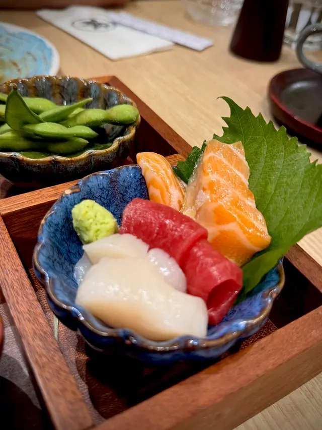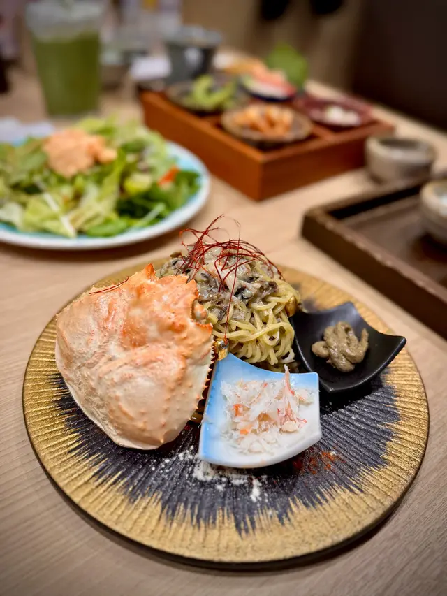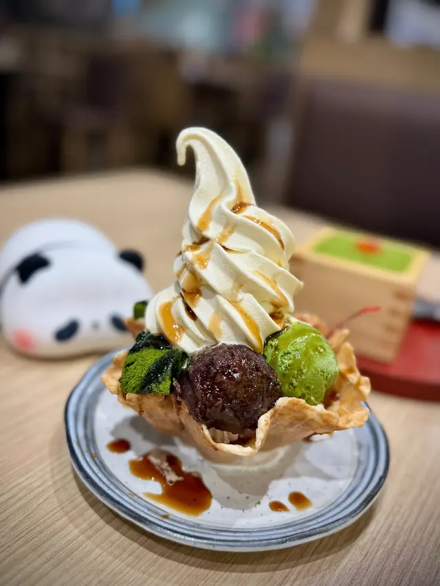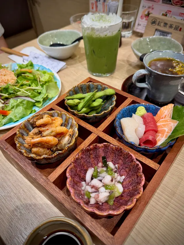 是晚接男友收工,起佢公司附近拍拖拖食飯佢同事介紹一間又可以滿足佢同我嘅餐廳我喜愛抹茶,他喜愛魚生日本野位於尖東帝國中心上一層的紅葉茶屋, 主打和式食物內裡都幾大, 載客量都幾多平日夜上嚟講都多客出出入入, 我見好多女士係專程嚟食甜品添餐廳用咗好多熊貓公仔佈置, 好可愛而我地最鐘意就係有set叫set, 有個二人前包含有我同男友喜愛的食物~前菜包括: 紅葉四點盛 (炸小蝦, 枝豆, 刺身3點和味噌八爪魚) 和龍蝦沙律加$48轉咗迷你角切魚生飯樣樣都非常精緻, 仲要上菜有效率! 但又唔係凍冰冰~檯上面多咗個熊貓燈, 打起卡嚟特別可愛又唔單調呢個炸蝦仔好好食, 連蝦頭蝦殼都可以食埋, 送酒一流 (餐廳有酒牌, 見有個MENU係朝日啤買一送一添)刺身三點有吞拿魚, 三文魚和帶子, 雖然是普通貨色, 但全部都新鮮也不是單薄的厚度主食我一早就睇中咗: 紅葉蟹味噌伴麵個麵入面已經有蟹膏同蟹肉拌過, 另外仲奉上沒拌過的2小碟, 真係好足料麵條份量又多, 帶點暖, 但又唔會煮到稔哂, 無反悔揀呢個主食男友就揀咗: 吉列豬扒及廣島蠔定食, 呢份係正正常常, 豬扒都是厚切, 同蠔都唔會炸到乾柴見有個三文魚他他芝士脆片都只係加$20, 男友話好想試下雖然上層已經有三文魚同埋香料嘅味道, 但也不減芝士脆片的芝士香濃味道, 真係超濃甜品方面都很精緻, 六選二(有些是要加錢的)我地揀咗: 抹茶提拉米蘇和抹茶白玉漬平時食開係咖啡味嘅提拉米蘇, 抹茶味就係第一次用上木盒盛裝著, 超日式和風, 好似去咗日本咁面頭佈滿抹茶粉, 層層有序, 甜品本身的甜度不高, 也有抹茶粉中和了甜度內裡的忌廉細滑, 但又唔會好漏另一份是抹茶白玉漬和紅豆茸, 配埋一杯超濃抹茶和黑糖漿丸子是沒甜味的, 它就像平日吃的湯圓軟軟糯糯, 只是內裡沒有餡料, 那個餡料(紅豆茸)就隨自己喜好配搭, 又或者只配黑糖漿也可呢份甜品都值得推介, 不過每人食3粒都會幾飽下, SIZE都似平時嘅湯圓咁大粒有白有綠, 又加了點橙色(似是紅蘿蔔), 打卡一流鐘意熊貓, 鐘意抹茶, 鐘意日系呢度真係一次過滿足幾個願望而且餐廳地方夠寬敞, 空間感大, 唔會覺得好嘈, 聚飯好地方…查看更多