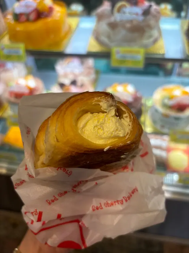 今日由港島過去深水埗買野,行下行下,見到黃色見門面,就知自己又行到黎紅車厘。經過好多次都冇食過,今次就入去睇下。一睇啲價錢牌,就已經覺得好平民化,難怪咁多街坊黎幫襯。我就是但買左個忌廉筒,盛惠8個半。食落都好一般,冇咩特別感覺,純粹搵啲野落肚咁。係出面睇,見到玻璃櫃都幾多款式,見佢糯米慈大大個都幾吸引咁。啲價錢牌好搞笑,全部都會有個正價同優惠價,睇到有點眼花。呢一日見到有個BB仔喺門口大哭,佢呀媽向店員解釋,BB鍾意食麵包,好想快啲有得食先喊,令到大家都笑哈哈。查看更多