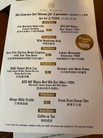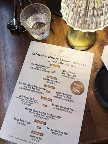 同另一半专登试咗呢间餐厅嘅二人套餐,原价过千蚊,而家特价就食到😍🌟六道菜晚市二人套餐 $699每人有头盘加汤品加主菜一加主菜二加甜品加餐饮,合共六道菜👍🏻🌟头盘 香草鱼茸薯仔沙律薯蓉打得绵密滑溜,食到一丝丝鱼嘅质感,不过留意返佢系冻食🌸香草同柠檬酱唔算浓味,清清地几好!🌟汤品 野菌忌廉汤有菌香但更多嘅系Creamy嘅质感,佢唔系𠮶种有口感,而系质地超级滑身,每啖都饮到菇菌独有嘅香气💕🌟🌟主菜 低温慢煮鸡胸扁意粉配冬阴功酱汁惊喜之作!鸡胸用慢煮保持肉质软嫩,完全唔「鞋」口,冬阴功酱汁酸辣醒神,味道对板!将冬阴功汤应用落去意粉度都可以百分百还原返个精髓!呢个fusion同埋个鸡胸,创意同味道都系一百分,好好食🥹🥹🌟主菜 红馆姜母鸭利申吓呢个系男朋友嘅主菜👍🏻鸭腿外脆入面好嫩,我食咗少少觉得味道有啲似烧味嘅烧鸭😂男朋友就话似乳鸽😂好似形容得好low但我哋一致认为呢个系普通烧味舖同酒楼都做唔到咁高水准嘅鸭髀😍劲好食!配上姜同橙杏果酱平衡腻感,好出色💕💕🌟🌟主菜 澳洲M5和牛肉眼扒 +$198唔系夸张,呢个系我今年食过最好食嘅牛扒,没有之一!!!未食嘅即刻同我去食!就算要加钱都要叫!佢油花靓唔靓我唔知道,我叫咗medium,肉质个出乎意料地软嫩🥺佢唔系行Cap有口感嘅𠮶种路线,而系Juicy🥹𠮶种Juicy嘅程度就好似只牛游紧水咁样🥹我从未食过咁Juicy嘅牛,而且牛味都好浓郁🥹佢另外有一啲肥膏位,男朋友系完全唔理一嘢啪落口🫨结果我胆粗粗跟佢咁做,佢嘅肥膏位系特别浓牛味,油香十足😍好正!🌟甜品 芒果拿破仑一上枱男朋友就灵魂拷问问芒果拿破仑究竟要点食?😂😂😂笑死😂酥皮脆到一刀切落「咔嚓」声,口感系酥脆唔易散开,唔错👍🏻不过牛油味唔算好浓🌸吉士酱倾向似奶黄嘅感觉,甜度适中,芒果清甜多汁,觉得比起啲芝士蛋糕,拿破仑更显诚意👍🏻🌟餐饮 柠檬茶冇乜特别,正常发挥-呢间餐厅真系好食,强烈再次推介个意粉同埋牛🥹…查看更多
