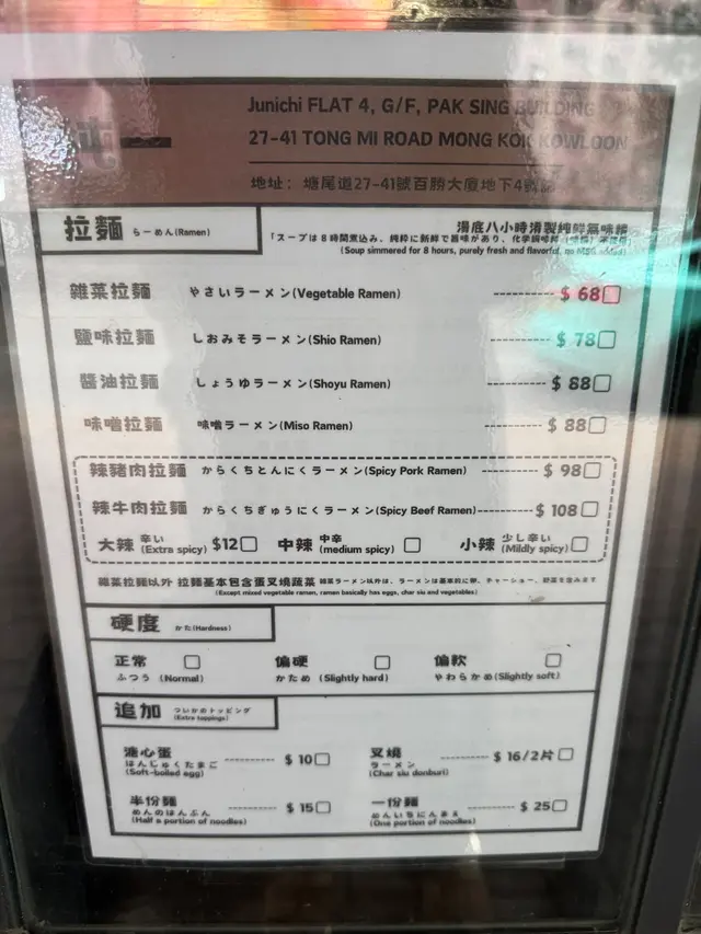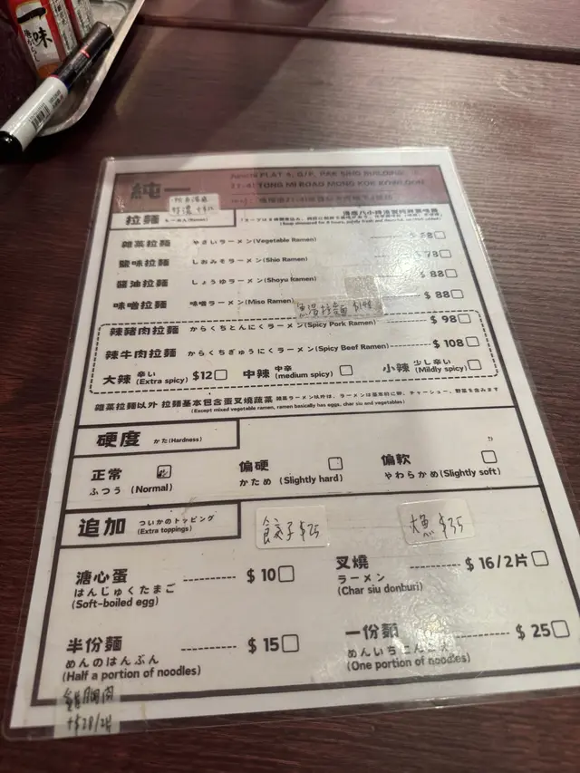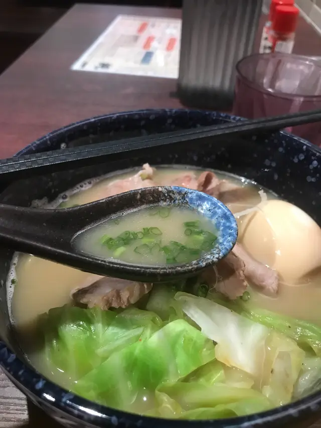 辣豬肉拉麵(小辣) ($118) ★★★★★有兩塊較瘦的豬肉片及兩塊肥瘦參半的五花腩,照顧到不同口味食客的喜好。這碗豬肉湯也貫串餐廳的少油清爽風格,感受到是純粹用菜肉熬煮而成,沒有加很多調味料。辣度很適合我,有一點刺激感,又不至令舌頭麻木,麵上的辣椒絲及蔥絲都恰到好處。麵質沒有鹼水味及尚算煙韌,加上溏心蛋沒有什麼挑剔的地方。