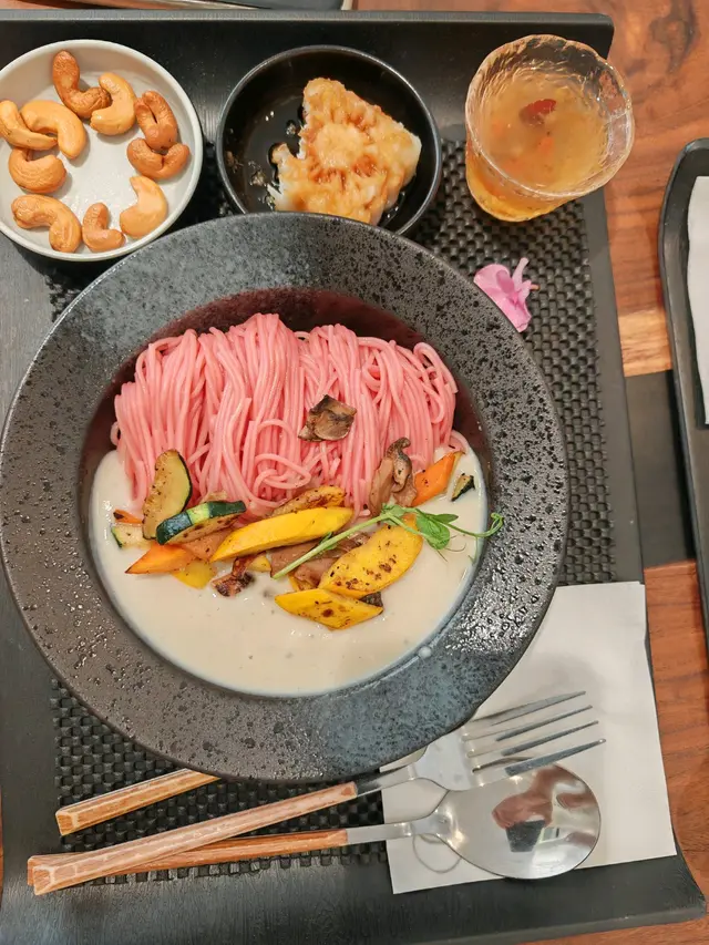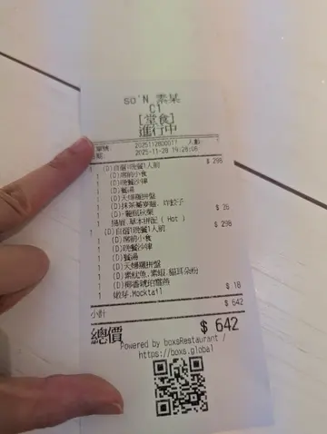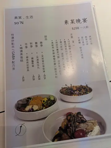 素某 so’N 的素食不只给人一种健康的感觉,也能是一种美学。之前有吃过午餐且觉得不错,这次特地再访,来试试它的「素某晚宴」。依旧是简约舒适的空间,但随著夜幕低垂,夜晚的柔光让空间氛围变得更沈静。而且在这里能感受到那份「慢」的节奏,体会「食」与「心」之间的平衡。素某晚宴 (HKD 298/一人前) 首先会有席前小食和素菜沙律。小食有秋葵、牛蒡与虫草花,浸在清爽的酱汁中。三款口感很有对比,而且味道轻盈得来很有层次,恰好开启味蕾。素菜沙律除了沙律菜,还有葡萄柚丝与樱桃番茄,加上微甜的醋很开胃。是日汤品是香气扑鼻的牛肝菌汤,味道非常浓郁,入口时能感受到厚实的菌香。喝起来层次感相当饱满,亦很顺滑细致。另外还有炸得香脆的野菜天妇罗。会有南瓜、番薯、香菇和茄子,可以依个人喜好蘸淮盐来提味。主食选了 烧大啡菇.温野菜.山药慕丝。摆盘颇吸引,配上可食用花点缀,让整体看起来相当精致。多汁有弹性的大啡菇,内里是菠菜和芝士。底层的山药慕丝很绵滑,没有太多黏稠感。山药有种自然的甘甜味,若觉得不够味,我觉得能搭配附上的青花椒油来吃。另外,一旁的温野菜则以多款菇类和露笋为主,炒得几惹味。昆抹茶荞麦冷面.自家制炸饺子 绿色荞麦面配上鲜色的素鱼生切片,视觉上色彩对比鲜明。荞麦面带有淡淡的抹茶香气﹐而且几有弹性。配上清爽微咸的汤底,整体不错。自家制炸饺子与冷面是一冷一热的搭配,饺子外层炸得很金黄香脆。内馅是满满的蔬菜与菇类,相对冷面来说也是浓味一点。可以加钱选择分成四季主题的甜品,这次选了当季的 丽枫秋栗 (+HKD 28),以及 精选素蛋糕 (+HKD 28)。番薯带著薄脆的焦糖层,甜香中带微微焦香,入口绵密。搭配香浓的栗子蓉和底层的谷物脆片,口感非常丰富且是很有秋意的甜品。蛋糕面层有甜度适中的青提子,吃起来整体很轻盈。晚宴会包一杯 特选拼配茶 / GABA 配方茶。最后点了 嫩芽草本拼配茶 & 嫩芽特调 (+HKD 18)前者入口清新柔和,还有清凉感的欧薄荷,十分适合作为餐后茶。后者则是以乌龙汤为基底,加入梨蓉、胡柚、橙皮与青柠制作以成的特调。入口时先感受到乌龙的茶香,然后便是果香的交织。…查看更多