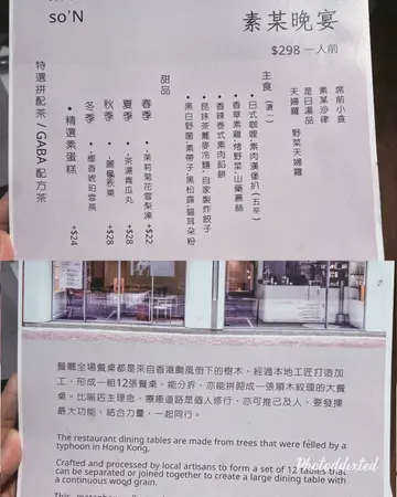 素某 📍:香港湾仔谢斐道254-272号杜智台地下9-10号舖🚗:湾仔地铁A1出口 步行8分钟📞:+852 52318787💲:~HKD300/head for dinnerFood quality✔️:自选晚餐一人前、晚餐沙律、餐汤、香草素鸡.野菜.山药慕丝、松露带子猫耳朵粉、椰香琥珀雪燕👌🏼:嫩芽.草本拼配、展开.草本拼配、天妇罗拼盘、席前小食总结:😋暂时系我食过最好食嘅素食餐厅 比起食物 我更觉得整个体验好好 餐厅走新派素菜路线 除咗食物 仲会举行心灵疗愈工作坊 一上枱餐牌就话餐桌都系嚟自台风倒下嘅树木🌲由环境 食物 茶品都好统一地走疗愈理念😋餐厅独孤一味净系得晚宴 $298一人前包小食 沙律🥗汤品 天妇罗 主食就五拣一 甜品就分四季或素蛋糕 另外拼配茶 好饱肚 由理念到执行都一绝 良好嘅体验😋每一道都好有心机烹调 菜式每日都会转 今日嘅小食系青瓜配红椒丝 落咗醋同芝麻 酸酸微微几开胃🤤沙律有惊喜 落咗藜麦同素松多咗嚼头 酱汁清新😋天妇罗🍤拼梅子粉好出色 冇咁腻 茄子最出色 炸粉唔厚够脆 里层仲食到茄子一丝丝口感 其余冬菇 南瓜就正常发挥😋今日嘅汤品系中汤 莲藕银耳花生🥜汤 虽然落咗红萝卜 但整碗汤冇炆到一丝丝 令碗汤清啲亦易入口啲 系碗好饮嘅中汤😋主菜系五款中选咗最多人拣嘅香草素鸡.野菜.山药慕丝同松露带子猫耳朵粉 前者素鸡略韧 但山药慕丝物如其名 顺滑嘅口感 伴碟嘅蘑菇🍄🟫好淋身入味 松露带子猫耳朵👂嘅松露味浓郁 素带子食落似鱼蛋 猫耳朵又够挂汁 好食😋甜品有四款代表四季嘅甜品 拣咗唯一唔需要加钱嘅冬季代表椰香琥珀雪燕 呢个真系超适🈴女士 好清润 仲有红枣够哂滋补🤔套餐包草本拼配茶 都系四款择一 我就听店员推荐拣咗两款口味较淡嘅嫩芽同展开 前者嘅风味系单欉 欧薄荷 香芧同桂枝 展开就黄大茶 桩叶花椒 松针同木姜子 两种都系淡得嚟又有茶香 茶味又唔会过浓适宜喺夜晚🎑饮😨张枱太细张 唔够位放 建议一碟食完再上另一碟观感会好啲 另外中间位置枱同枱嘅隔离太近 有点搭枱感觉🙊…查看更多